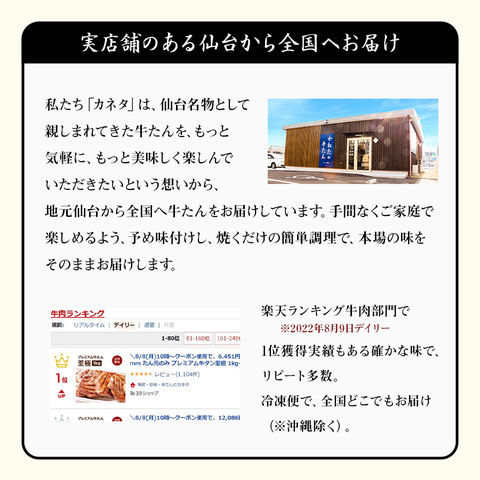 | 商品説明 | 牛たんの中でも“中心部”にあたるたん中は、程よい歯ごたえと濃厚な旨みが特長。焼肉店でもメインで使われる部位で、牛たんらしい味わいをしっかり堪能できます |
