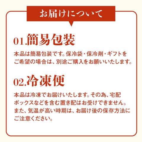 | 配送 | ヤマト運輸冷凍便。同様の冷凍商品のみ同梱可能。 |