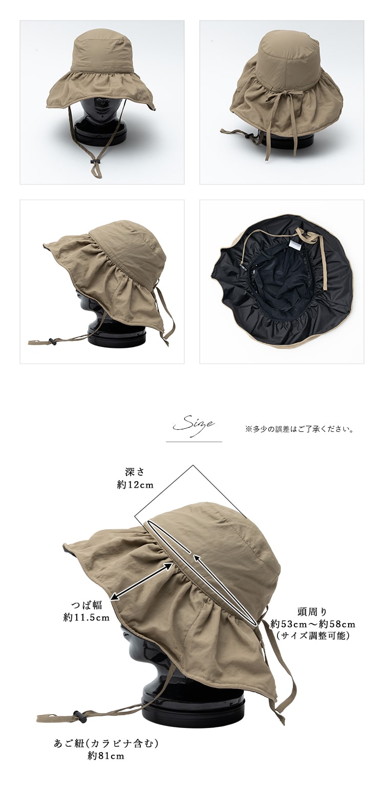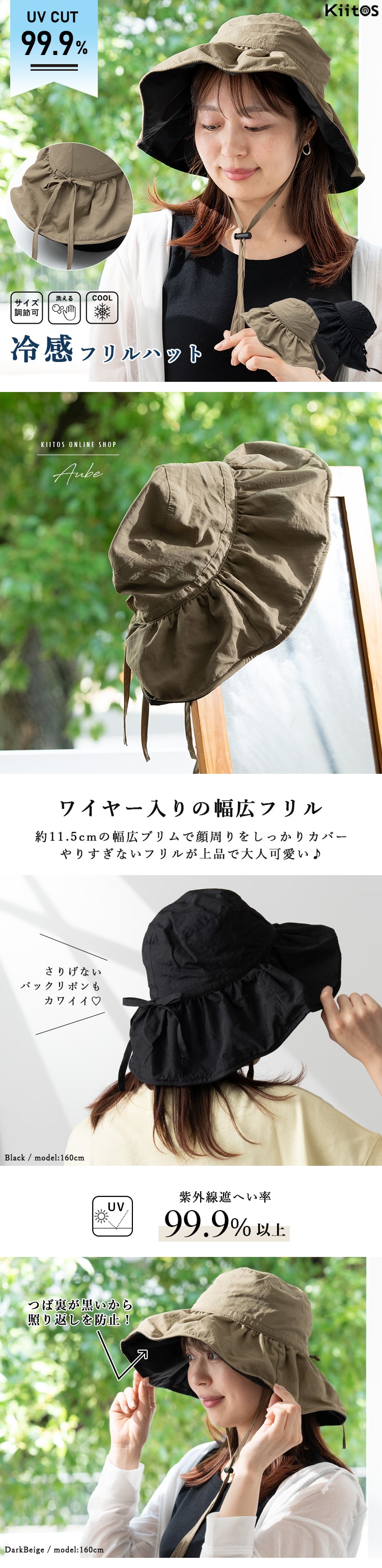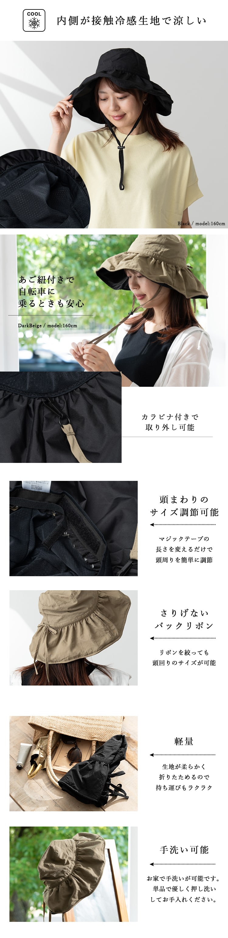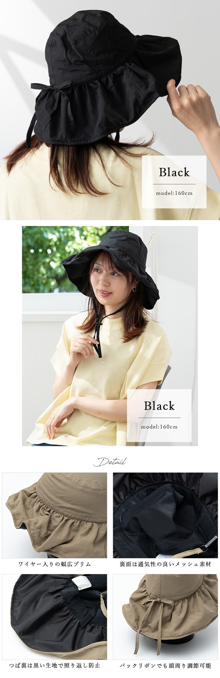 帽子 レディース ハット フリル uvカット 撥水 接触冷感 リボン あご紐 おしゃれ 深め サイズ調節 洗える 軽量 春 夏 秋 Black