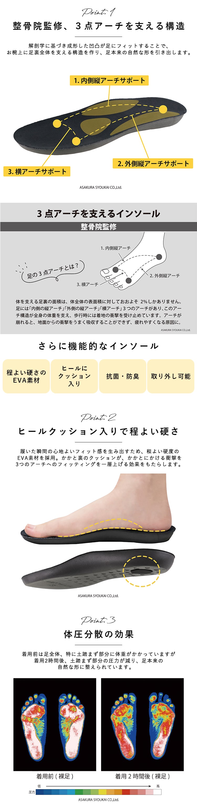 かかと裏のクッションが、かかとにかける衝撃を3つのアーチへのフィッティングを一層上げ、体圧分散の効果をもたらします。