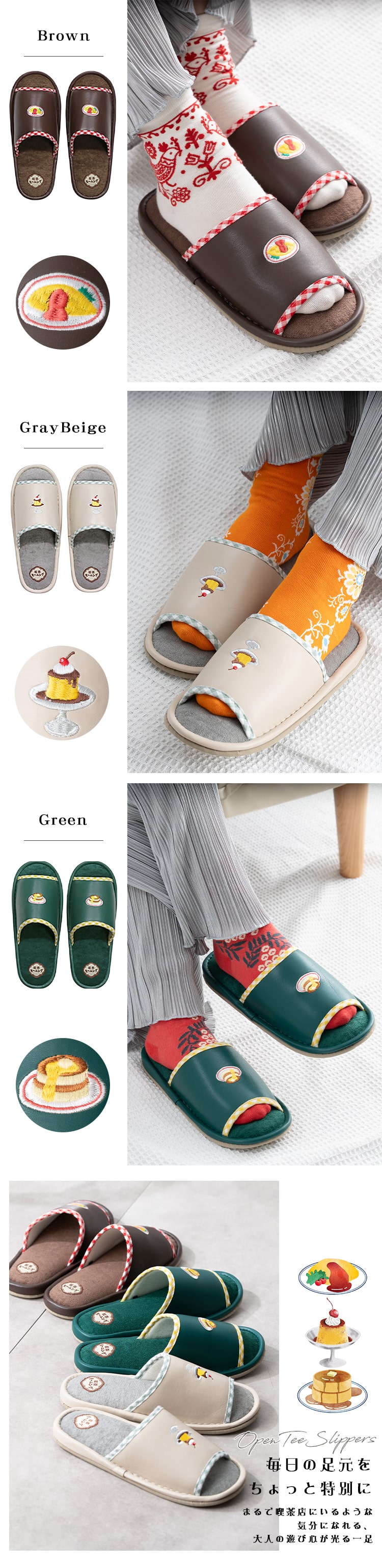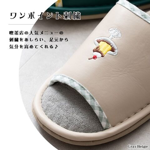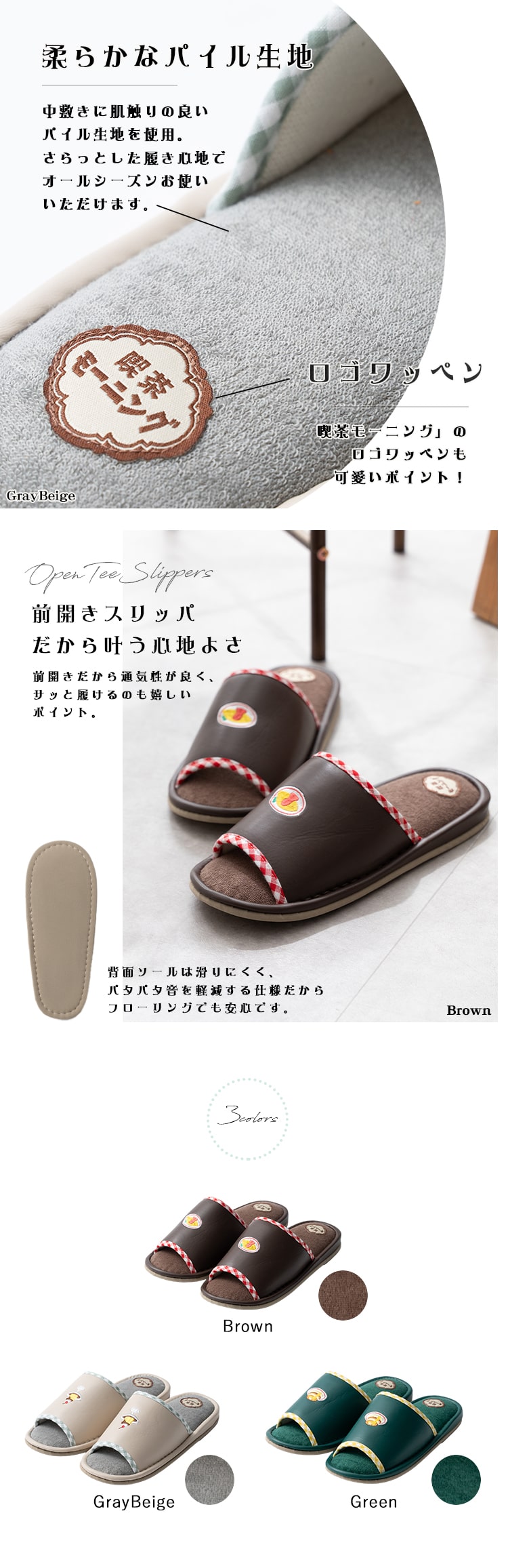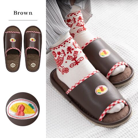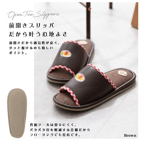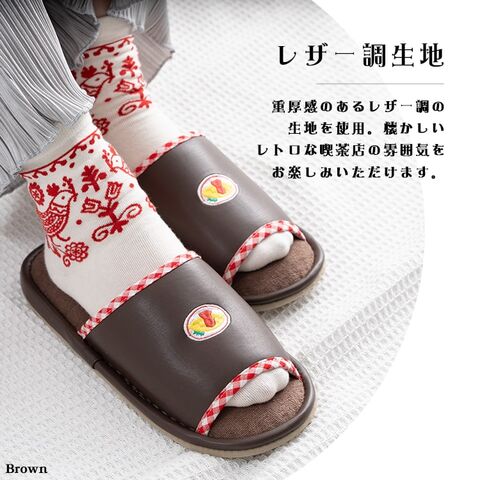 スリッパ レディース 前空き 室内 刺繍 トイレ 来客用 レトロ喫茶シリーズ 合皮 春 夏 秋 冬 パイル 蒸れない おしゃれ Brown