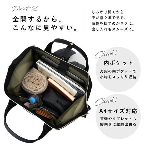 しっかり開くから中が隅々まで見え荷物を探すのがラクに、出し入れもスムーズに。