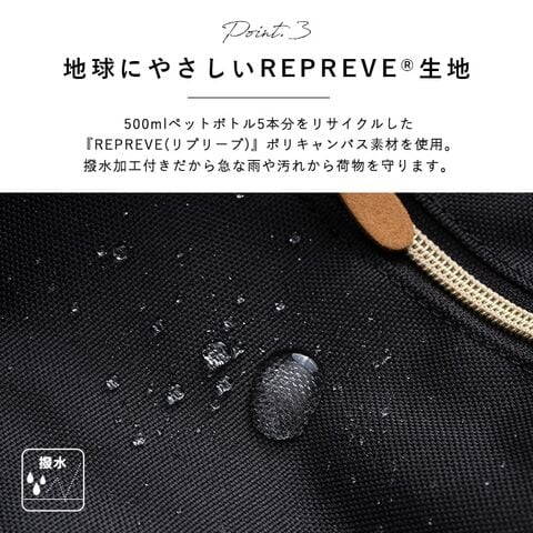 500mlペットボトル5本分をリサイクルした『REPREVE(リプリーブ)』ポリキャンバス素材を使用。