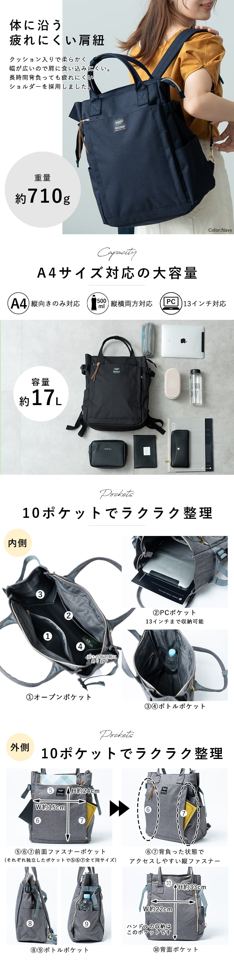 リュック レディース ブランド アネロ a4 大容量 通勤 通学 2way トートバッグ 自立 軽量 大きめ 10ポケット pc 13インチ 仕事 学生 Black