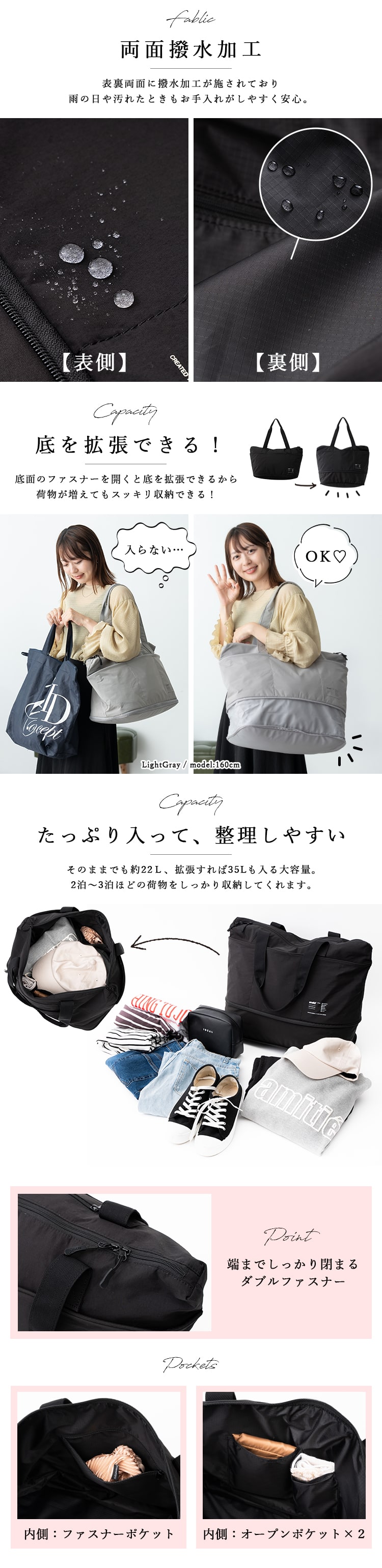 出先で荷物が増えた時は、底のファスナーを開いて拡張できる嬉しい機能付き。