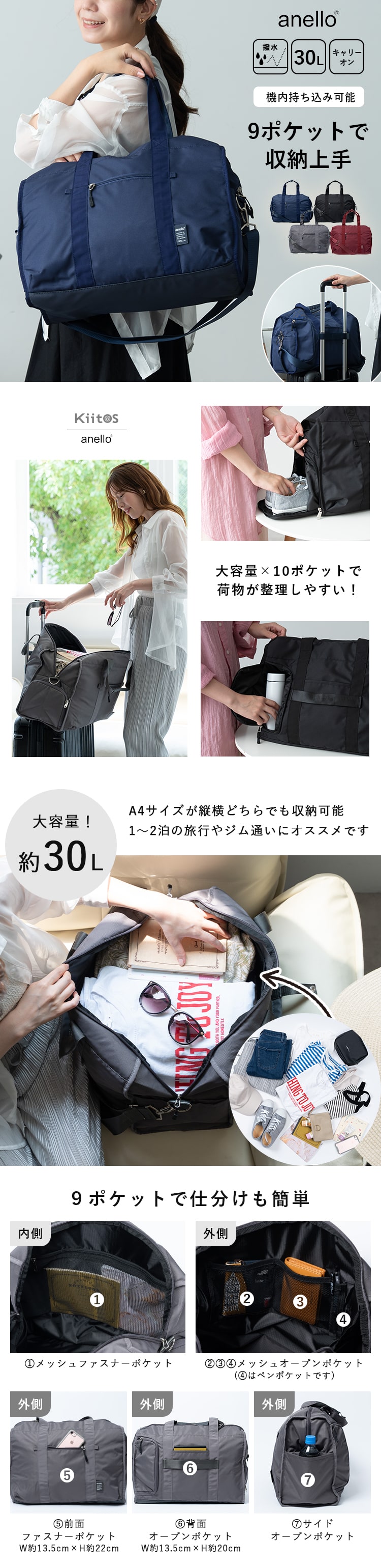 ボストンバッグ レディース 大容量 旅行 ブランド アネロ 撥水 9ポケット 軽量 おしゃれ キャリーオン 30L 2way 一泊二日 Black