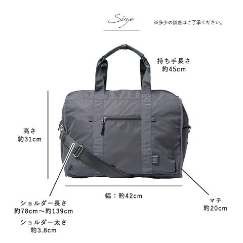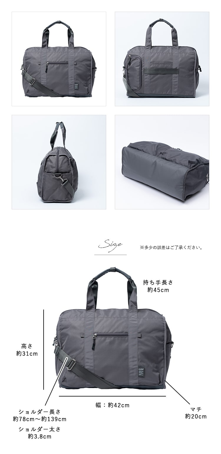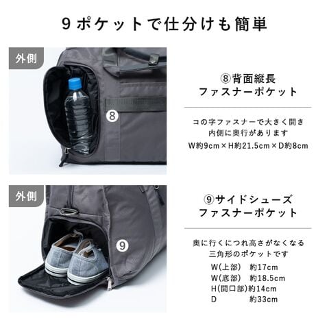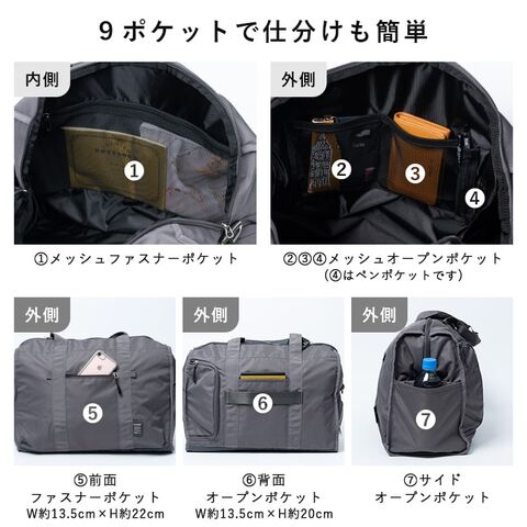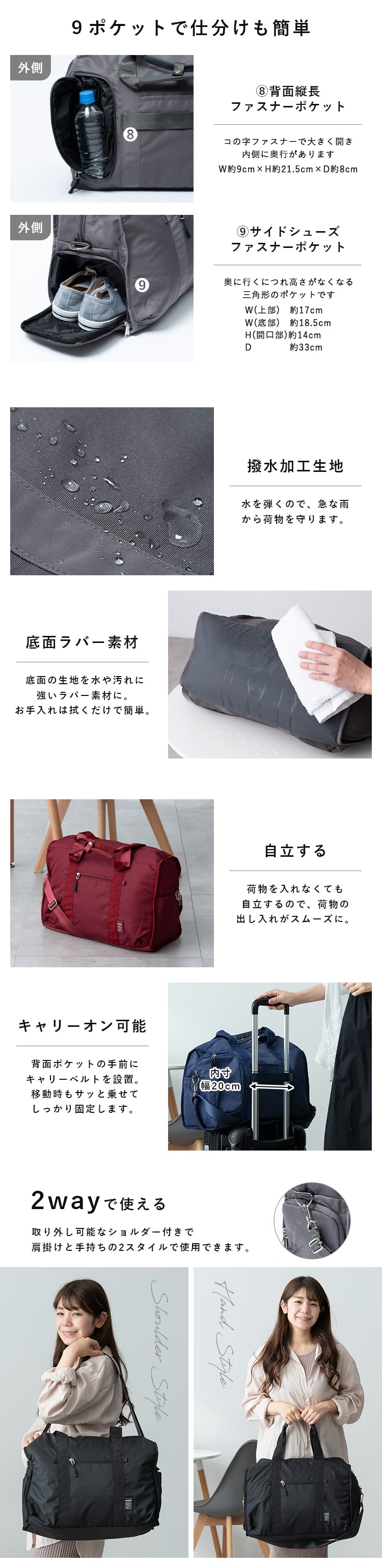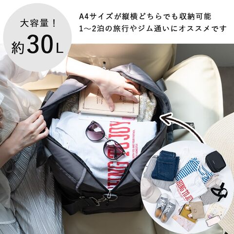 約30Lの大容量と9ヶ所のポケットで荷物をしっかり収納できるボストンバッグ。