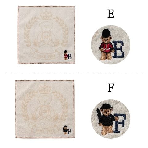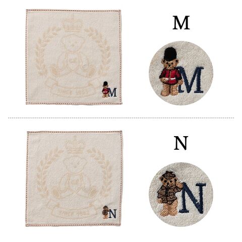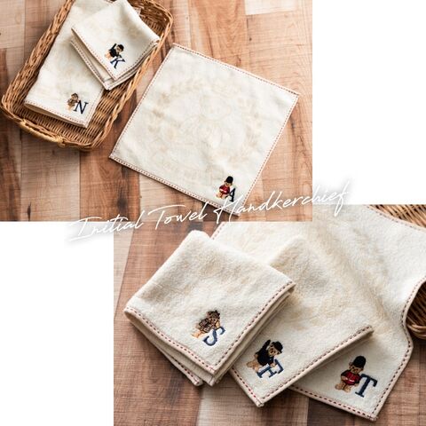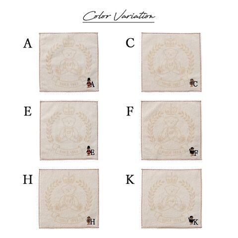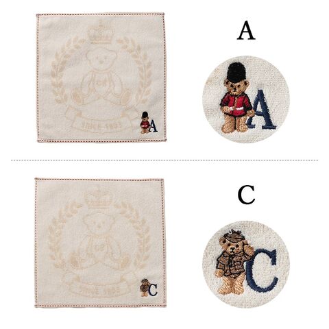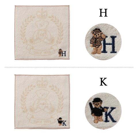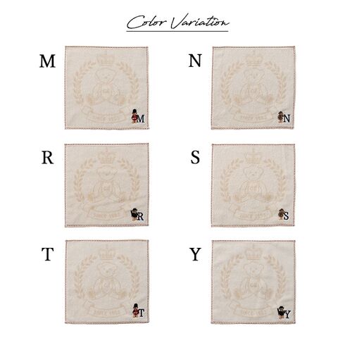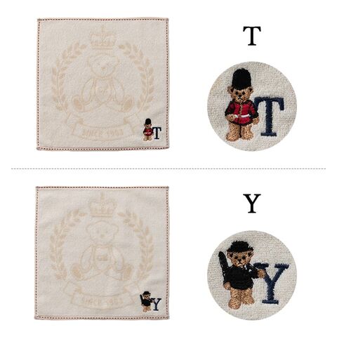 12種類のイニシャルと3種類のテディベアの刺繍を組み合わせイニシャル刺繍タオルハンカチ。