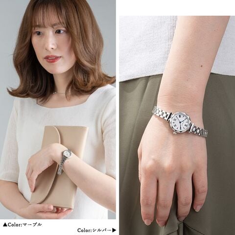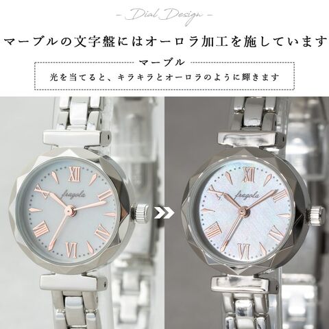 マーブルの文字盤は光を当てるとオーロラのように輝く加工を施し、手元を華やかにします。