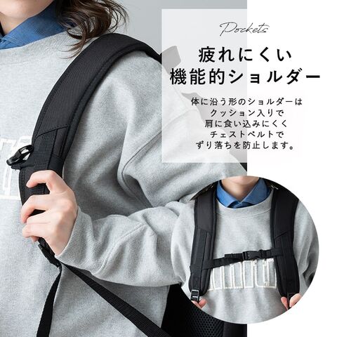 ショルダーと背当てはクッション入りでメッシュ素材を使用しているから、長時間の使用でも蒸れにくく疲れにくい。