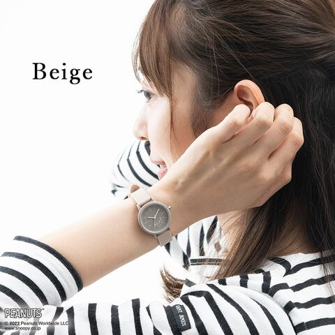 ベルトと文字盤が同色の落ち着いたニュアンスカラーで、白のインデックスやイラストが見やすく視認性もバッチリ!