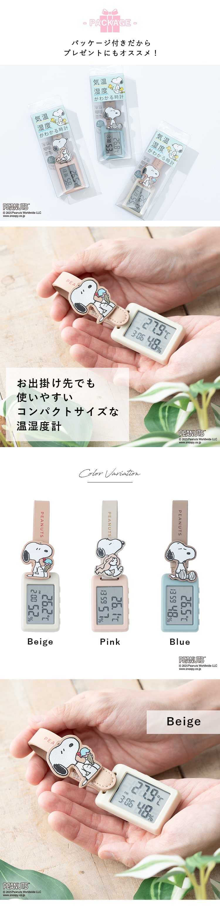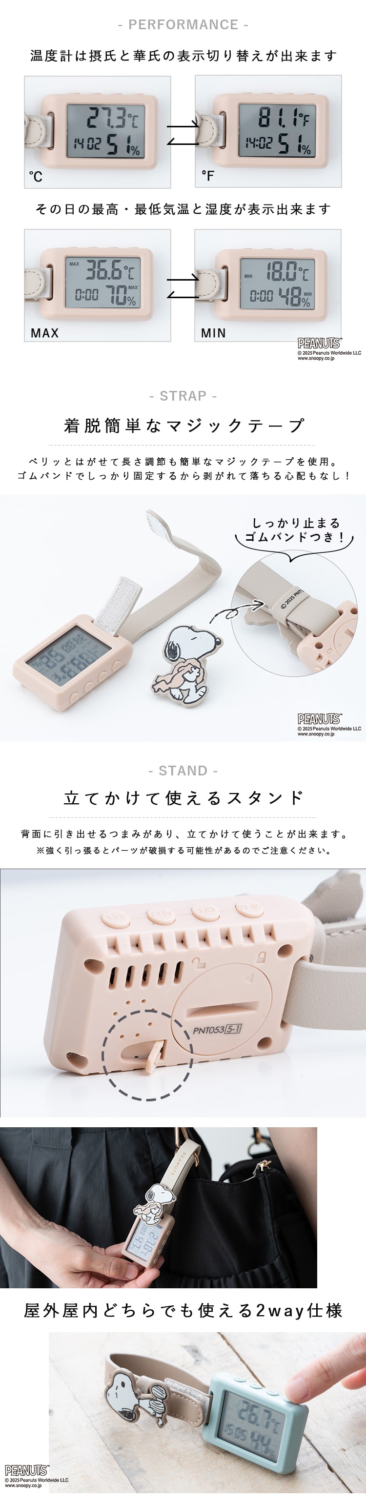 バッグにつけて外出先で、立てかけてお家で。2way仕様の温湿度計。
