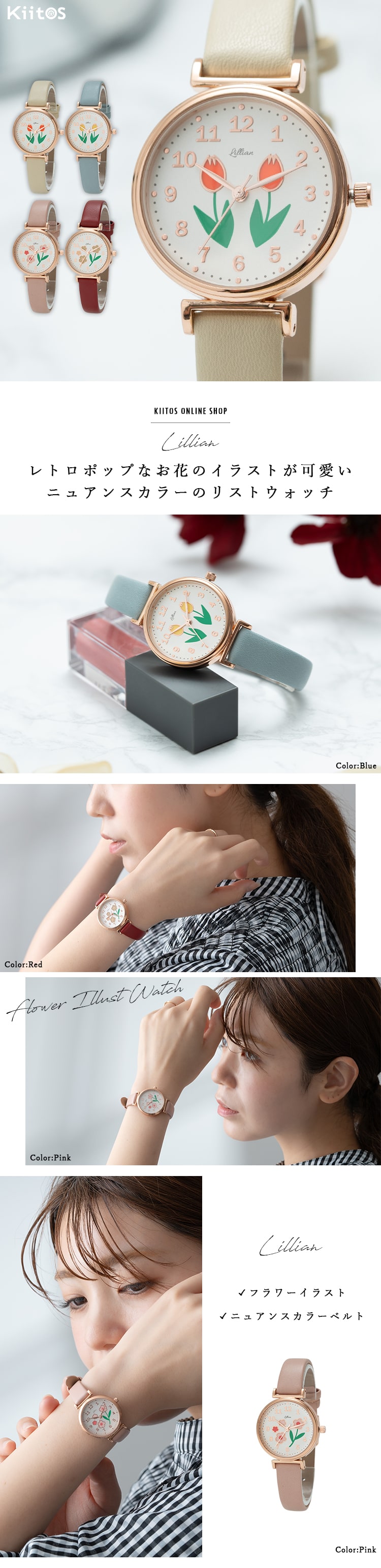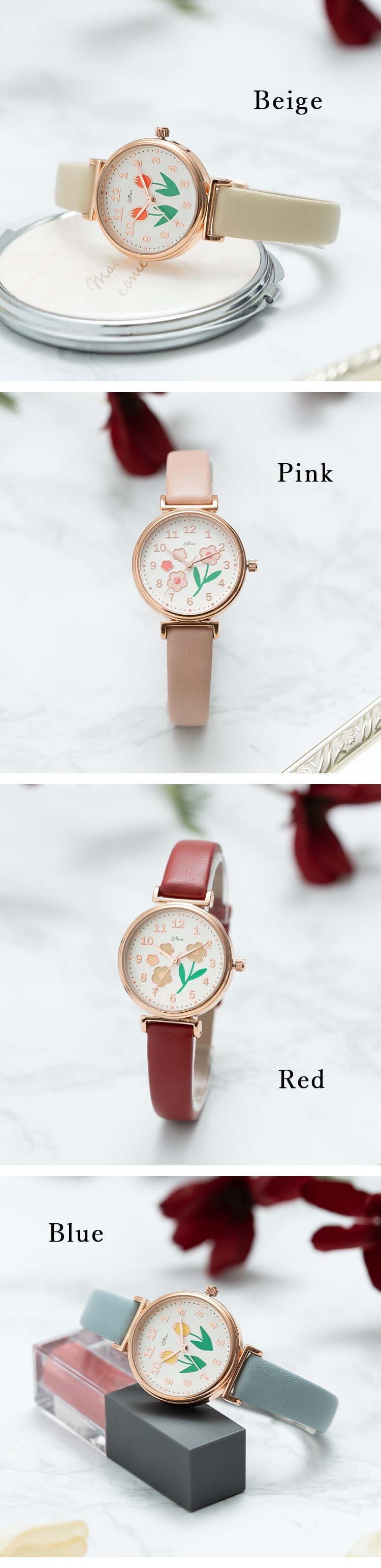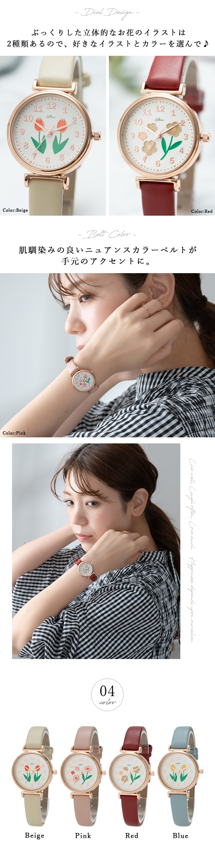 ぷっくりした立体的なお花のイラストは2種類あり、ベルトカラーによって色が違うのでお気に入りを見つけて♪