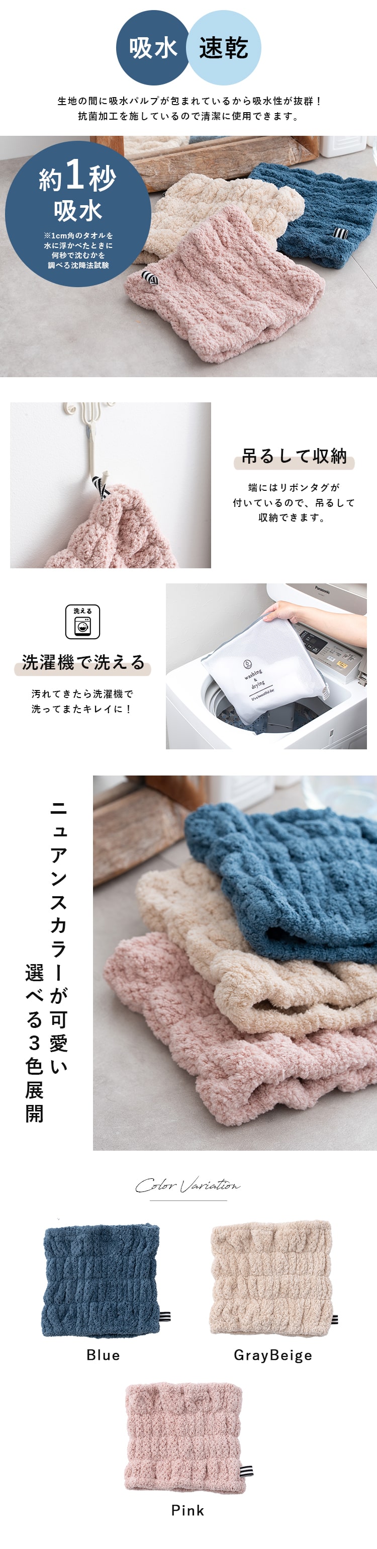 カットパイル生地なので髪に引っかかりにくく、ふわふわの肌触りで心地いいヘアタオル♪
