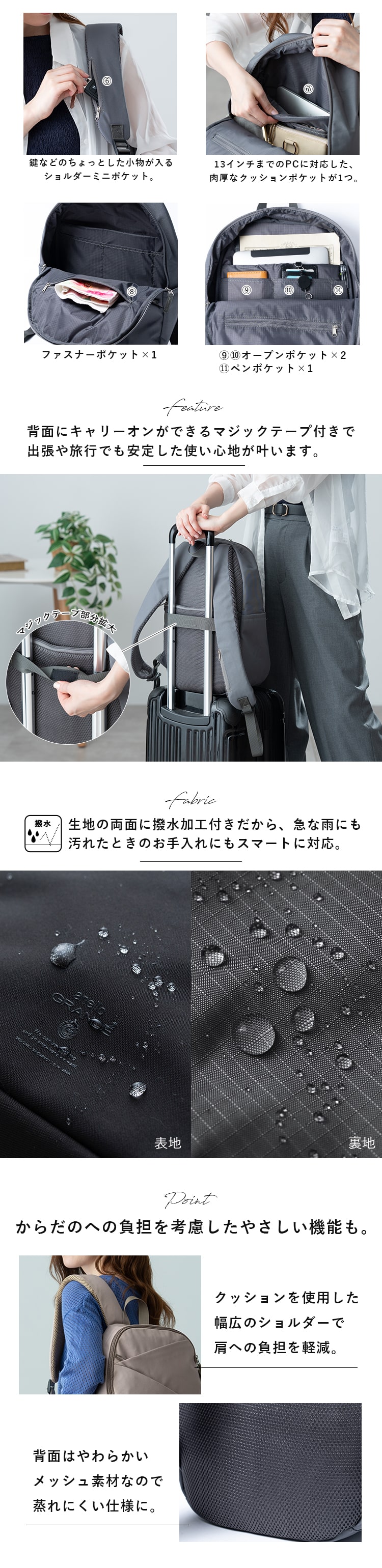 さらに13インチまでのPCに対応したクッションポケットや、キャリーオンができる背面マジックテープ、内側と外側合わせて11個のポケットが備わった充実の機能面。