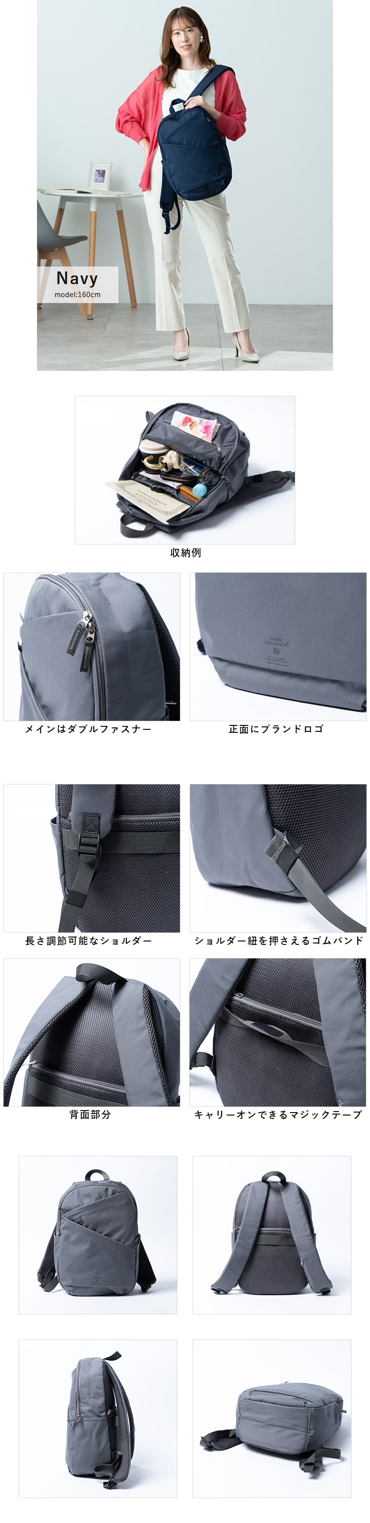 シンプルながらデザインや機能面にこだわった、飽きのこないリュックです。