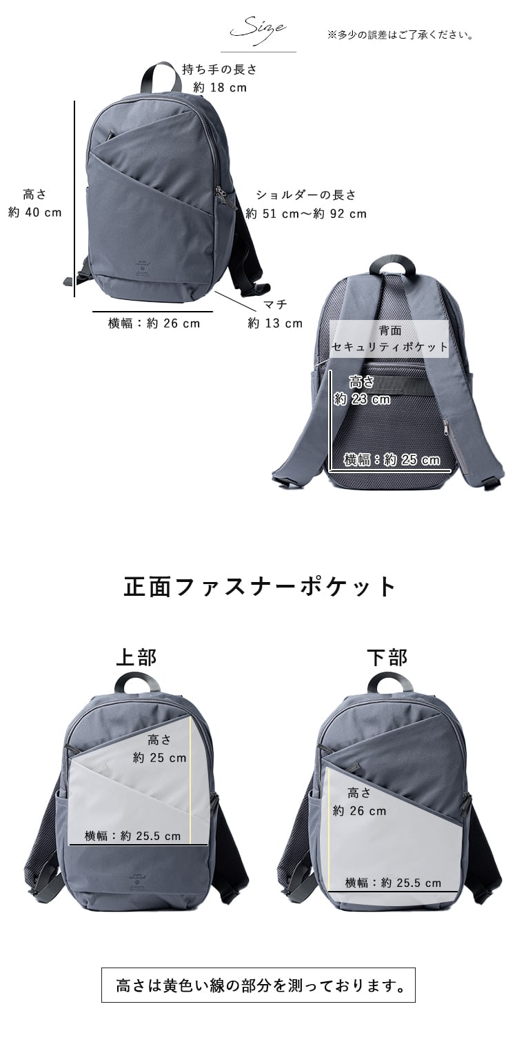 正面斜めファスナーポケット:H(上部)約25cm/H(下部)約26cm×W約25.5cm
