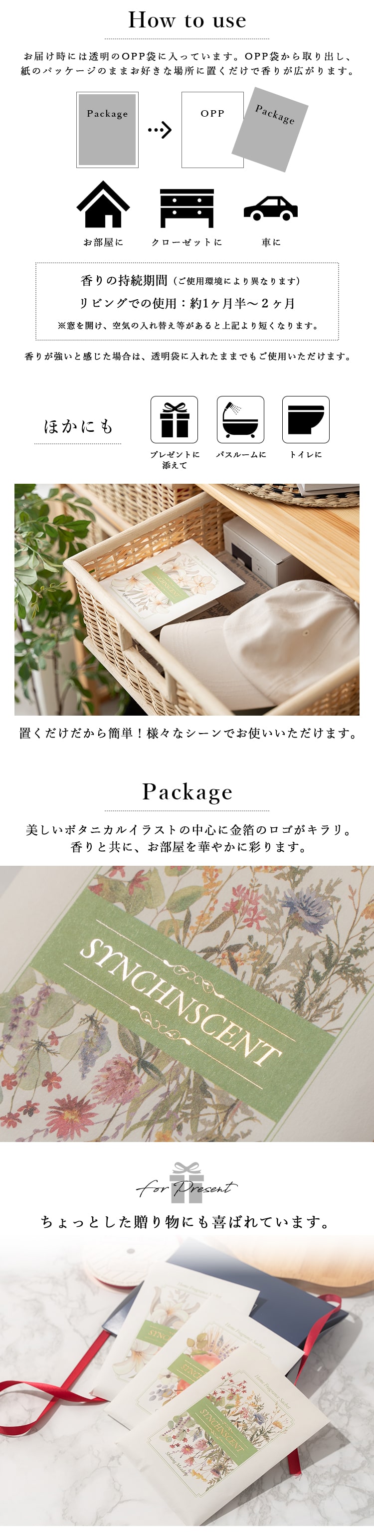 引き出しやクローゼットに入れて、衣類やリネンに爽やかな香りをプラスしたり