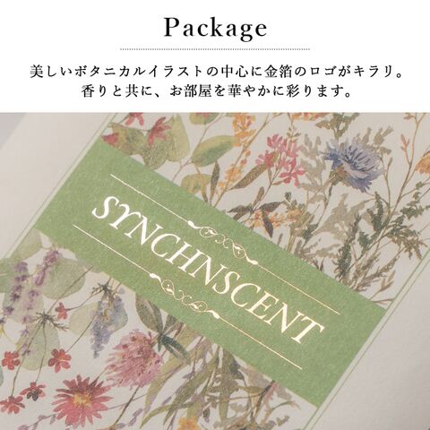 美しいボタニカルイラストの中心に金箔のロゴがキラリ。香りと共に、お部屋を華やかに彩ります。