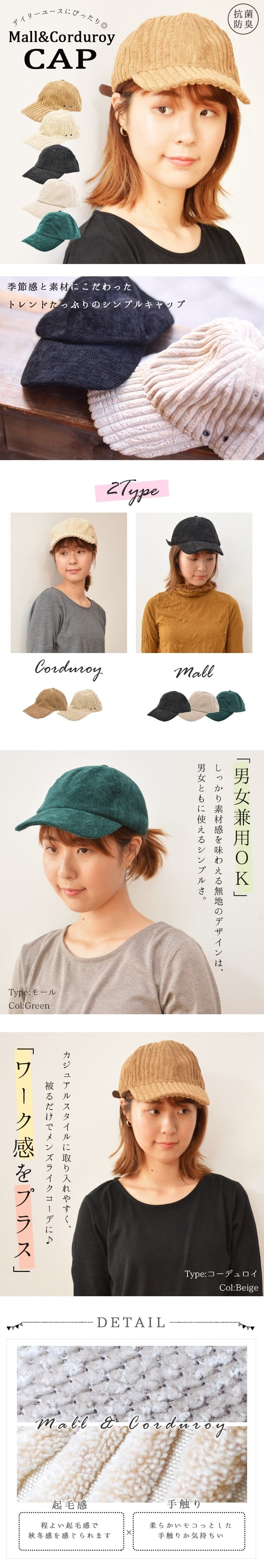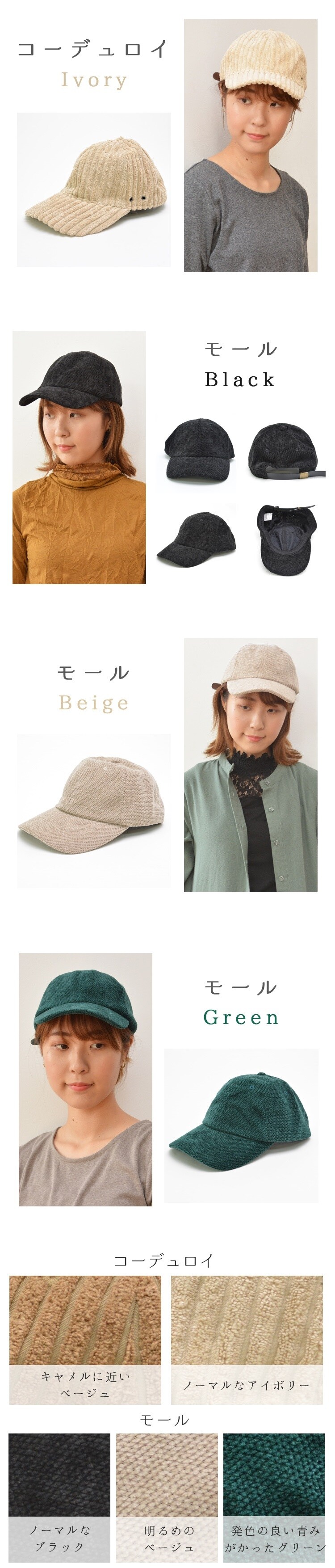 見た目も暖かく、肌触りがいいモール&コーデュロイキャップ。
