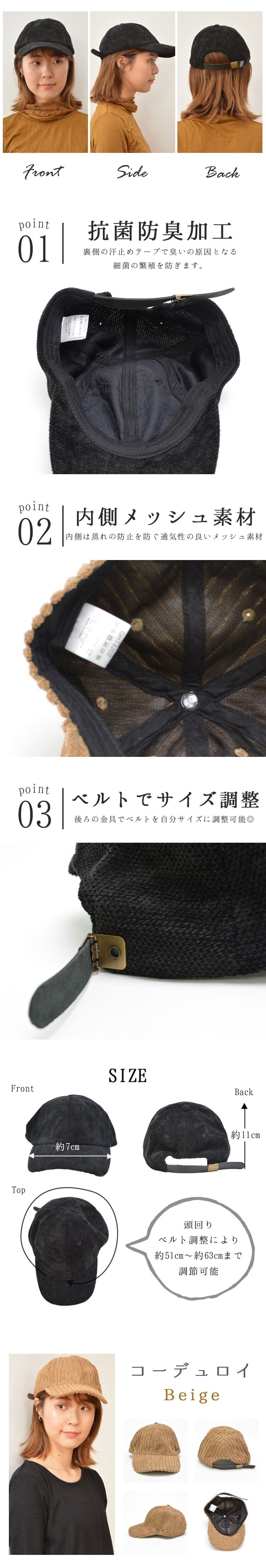 帽子 レディース ワークキャップ コーデュロイ モール かわいい おしゃれ 無地 サイズ調整 抗菌防臭 秋 冬 メール便送料無料 モールBlack