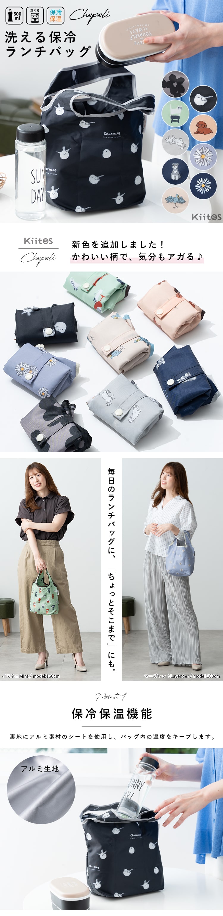 可愛い動物柄でカラーも豊富。色違いでも持ちたくなるコンパクトサイズの保冷ランチバッグ。