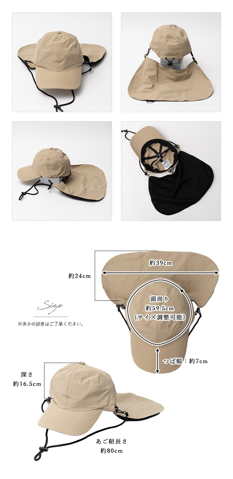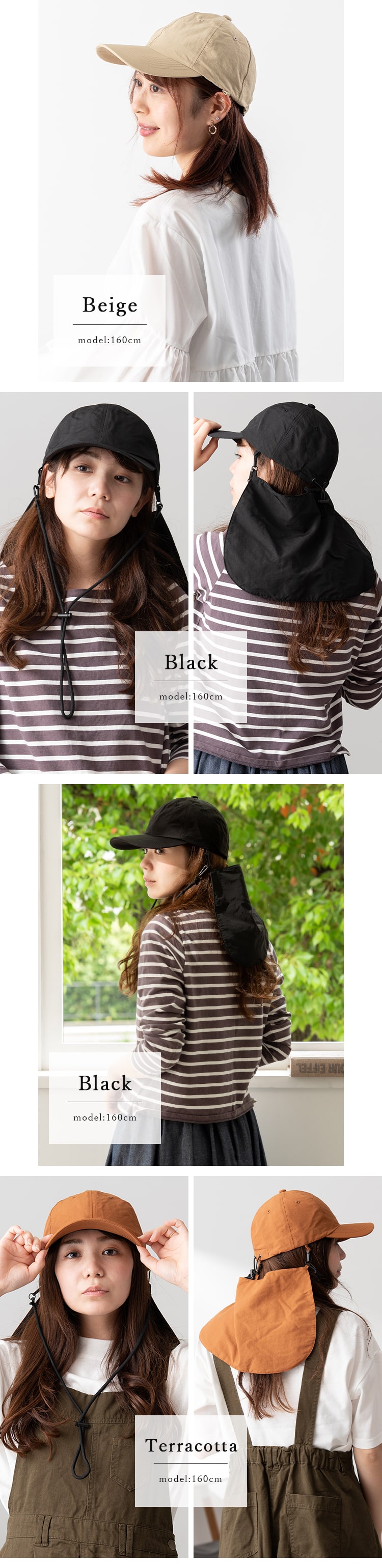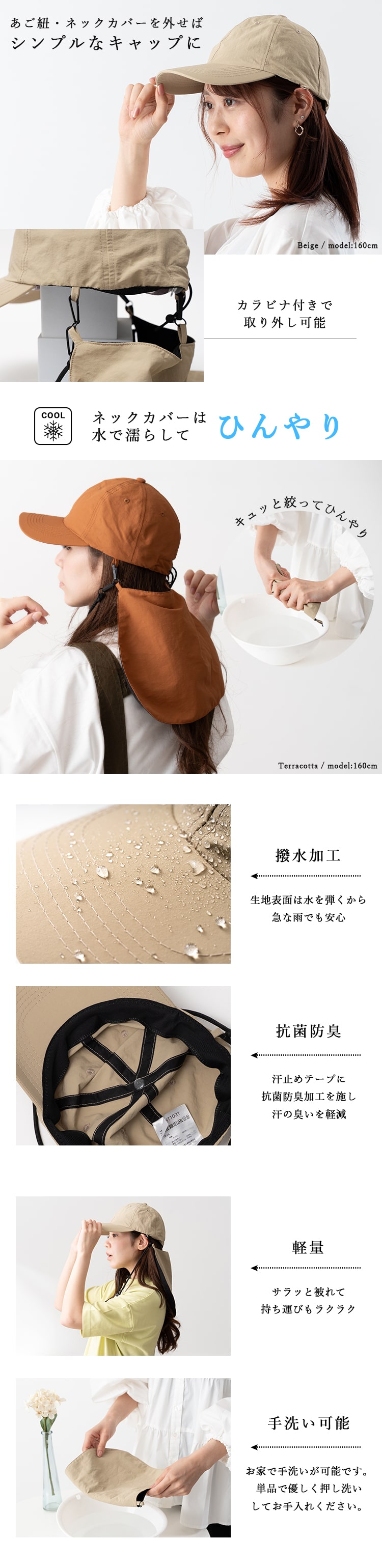 ネックカバーは濡らすとひんやりする素材を使用し、取り外し可能なのでお手入れも簡単なたれ付き帽子。