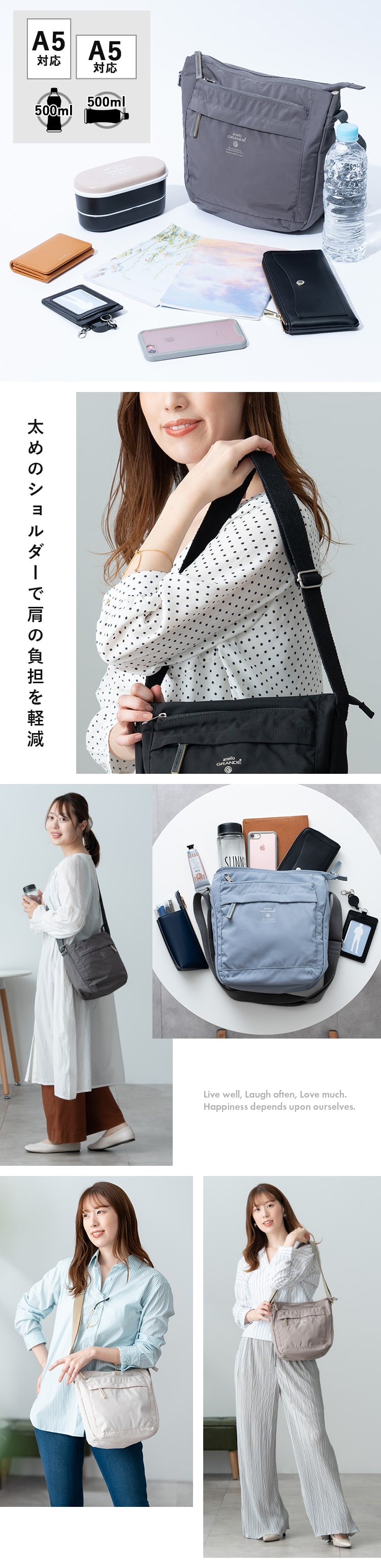 A5サイズ対応で500mlペットボトルや長財布もすっぽり収納できます。