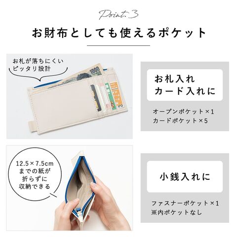 背面にはお札の入るオープンポケットと5枚分のカードポケットがあり、お財布代わりとしても使えます。