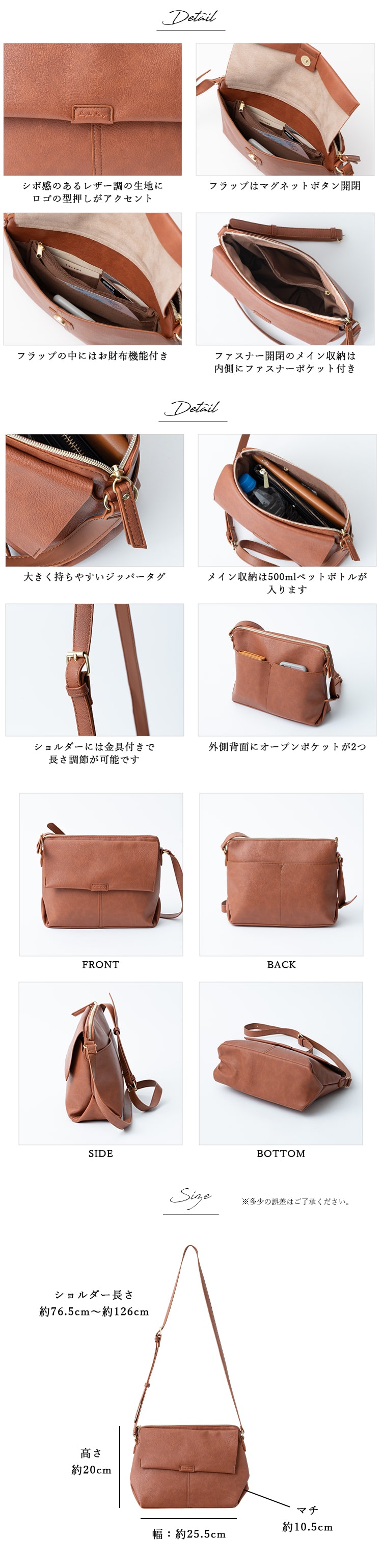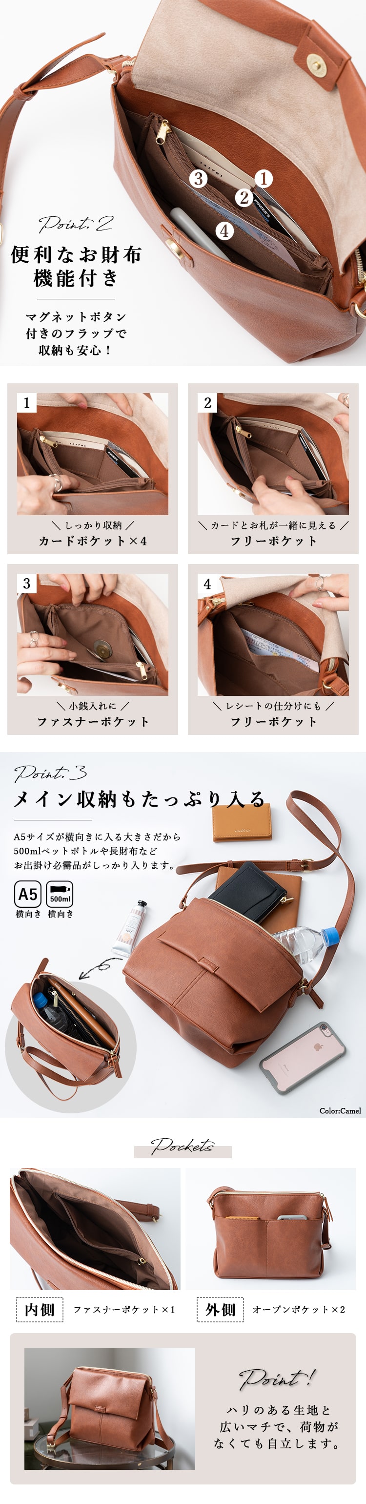 開閉:ファスナー、フラップ付きマグネットボタン