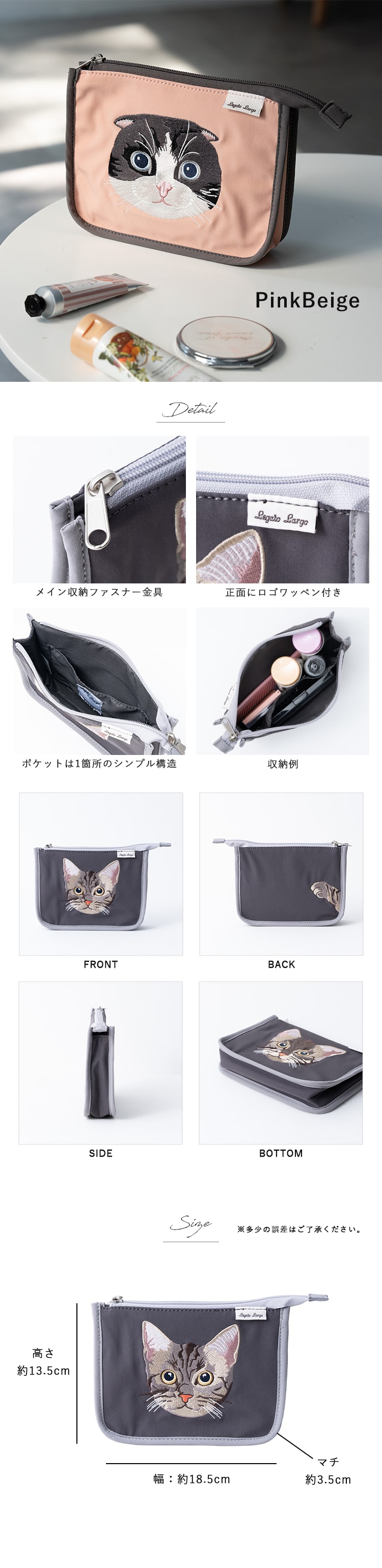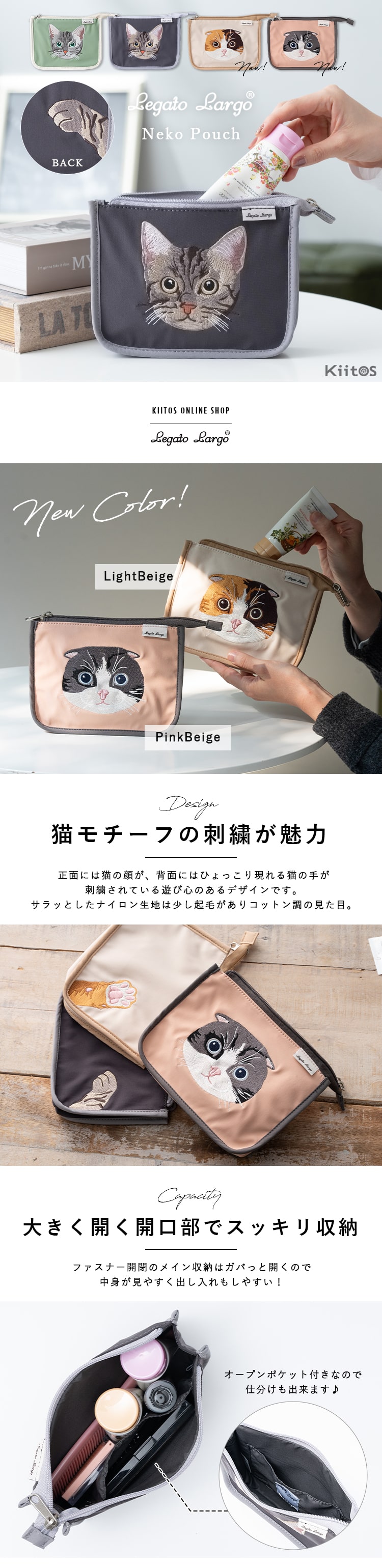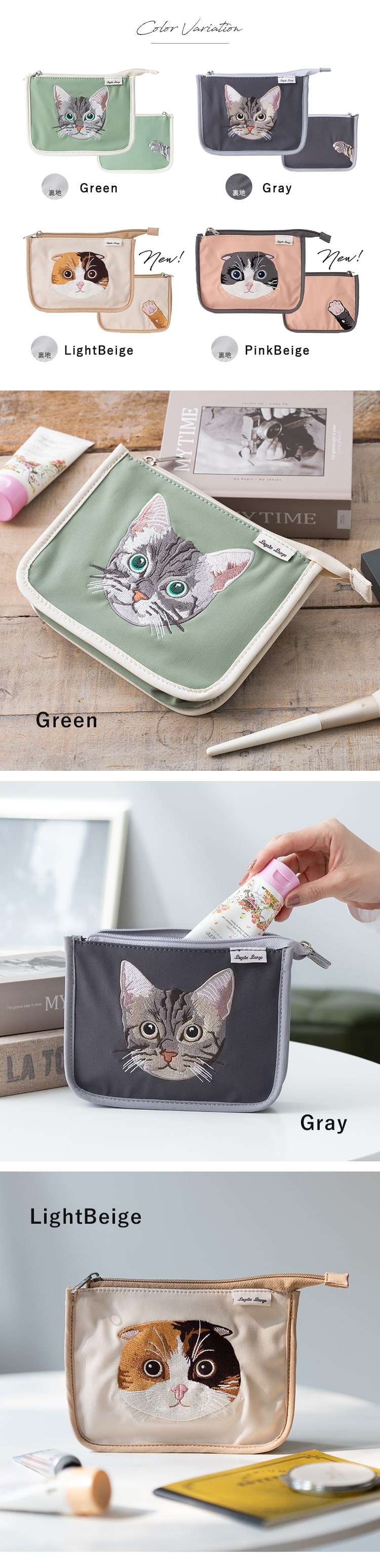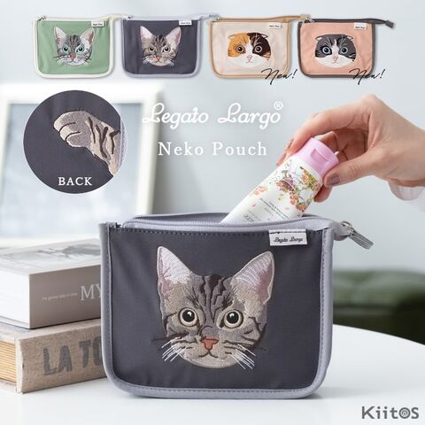 ポーチ 小物入れ ブランド レディース レガートラルゴ ネコ 刺繍 ギフト かわいい おしゃれ 化粧ポーチ 大きめ Green