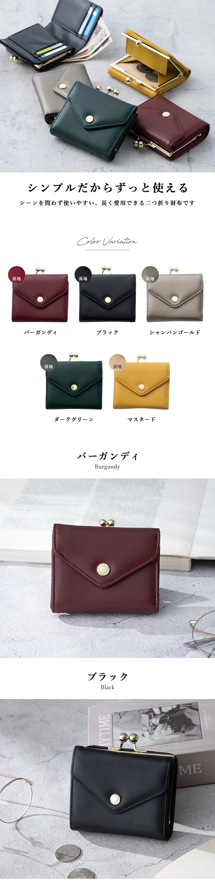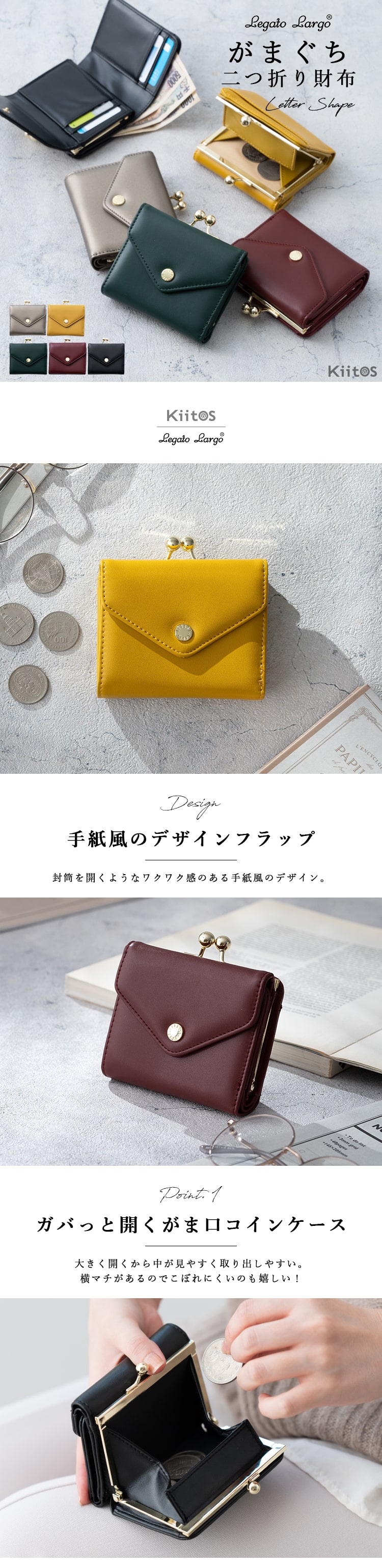 封筒を開くようなワクワク感がある、メール型の二つ折りがま口財布。