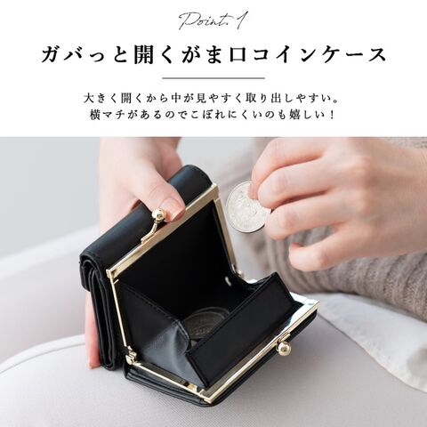 小銭入れはガバっと開くスクエア型のがま口で、横マチがあるからこぼれにくく出し入れしやすい。