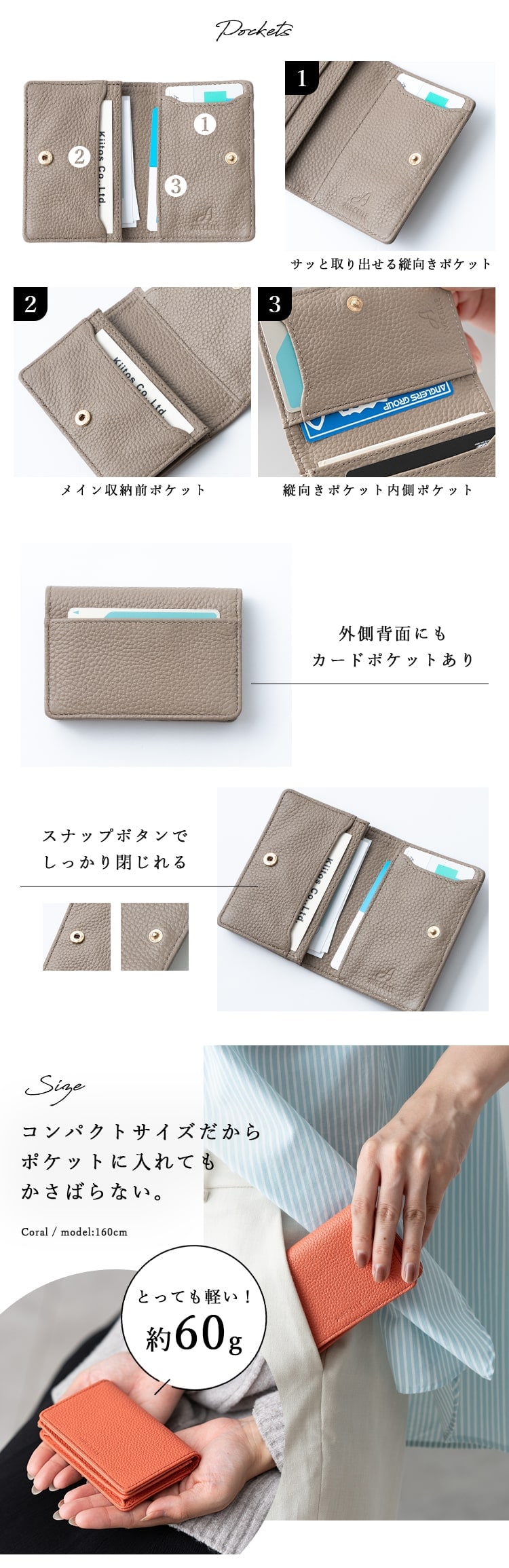 他にも内側に3ポケット、外側に1ポケットあり、サッと取り出したいカードは仕分けが出来ます。