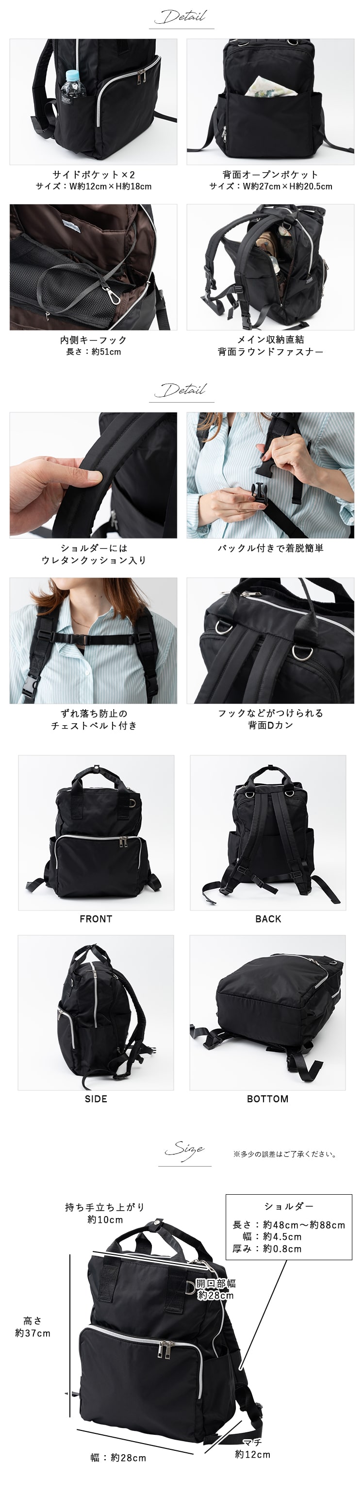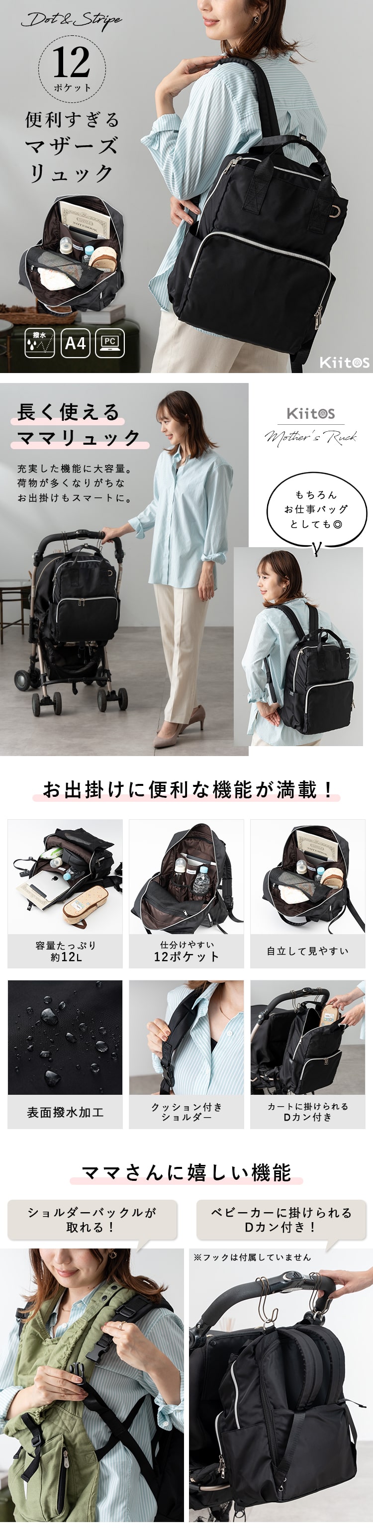 外せるバックル付きショルダーやフックなどを取り付けてベビーカーなどに掛けられるDカンなど、ママさんに嬉しい機能が満載◎