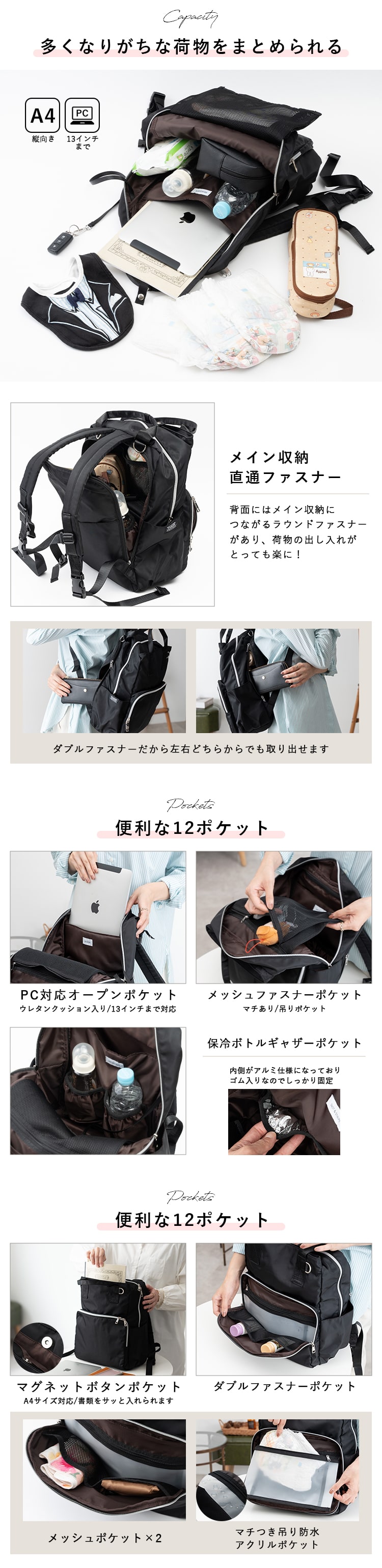 充実した機能にA4サイズ対応の大容量で、荷物が多くなりがちなお出掛けもスマートに。