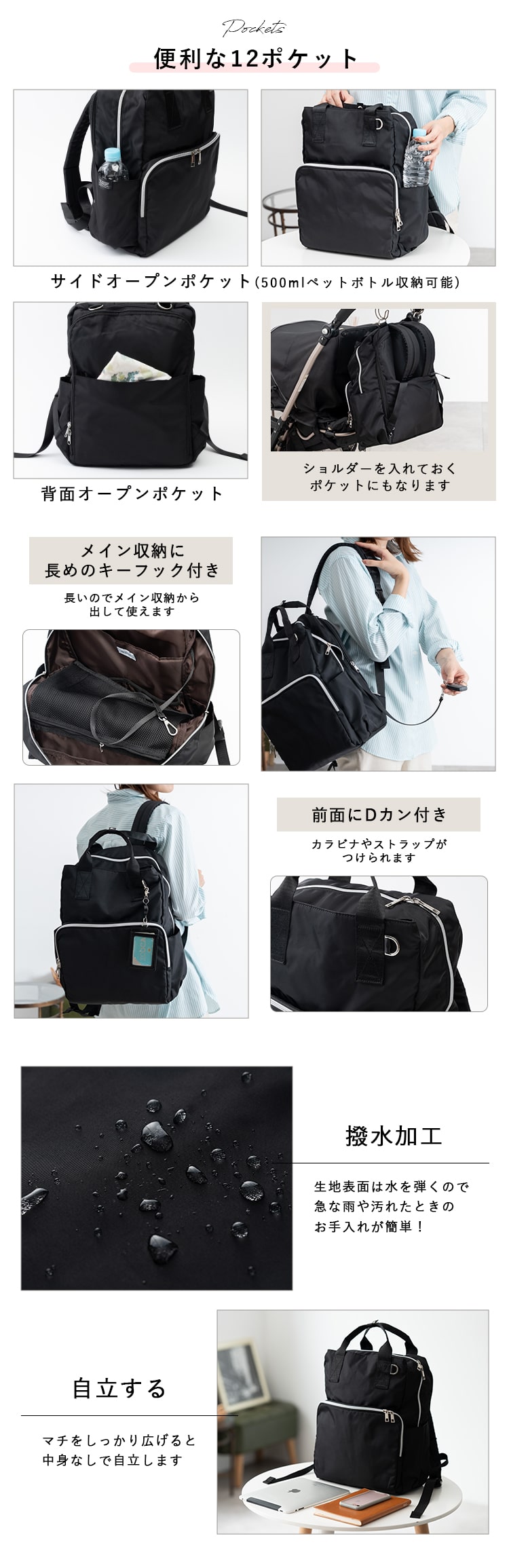マザーズバッグ リュック 軽量 撥水 12ポケット a4 おしゃれ 大容量 自立 多機能 ブランド 保冷ポケット 通勤 Black