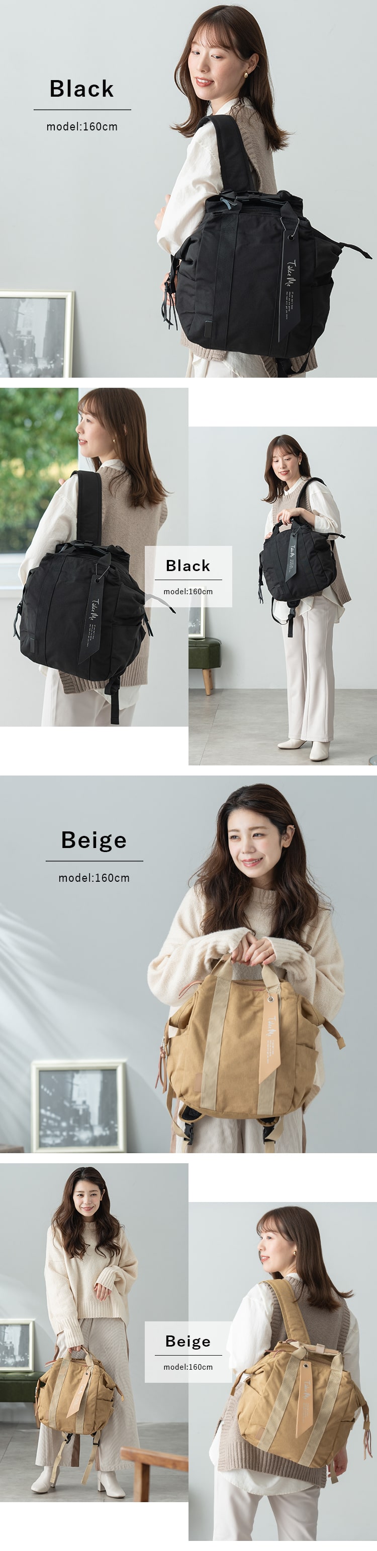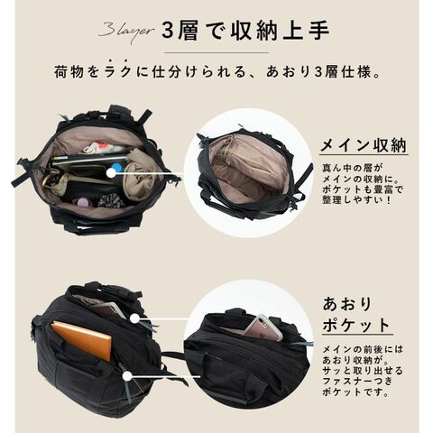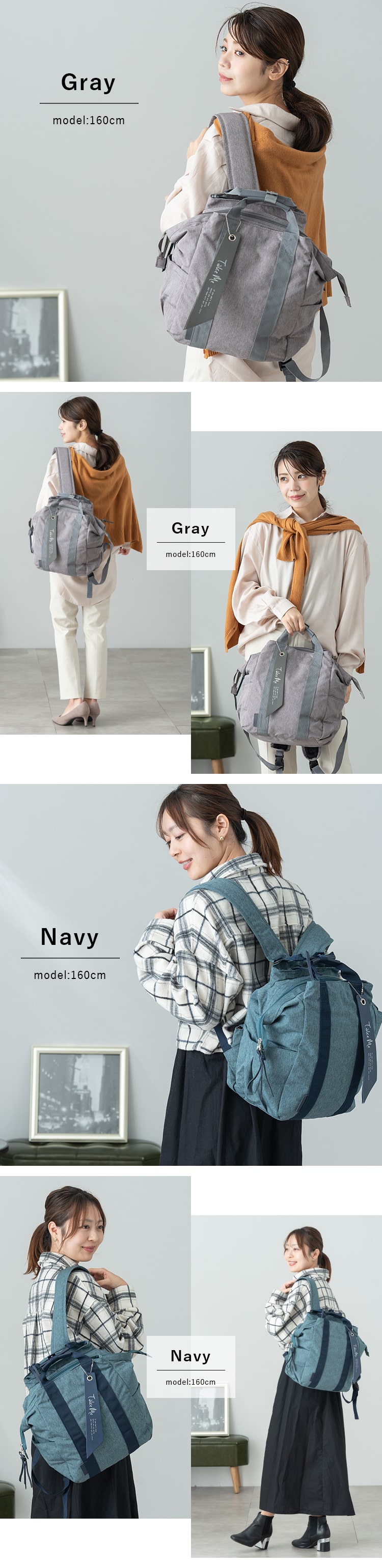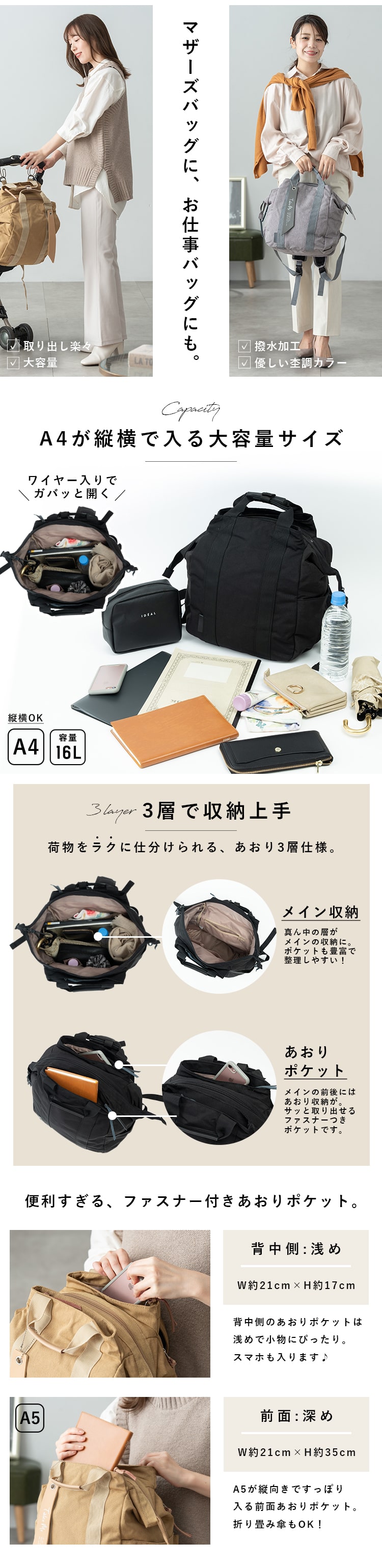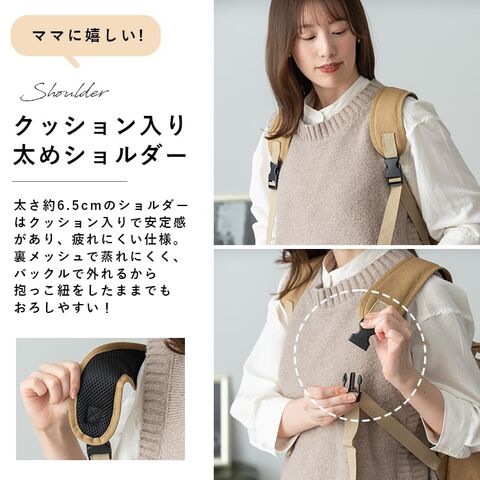 両手が空くリュックは、マザーズバッグとして、通勤、通学、旅行にと、とっても便利。