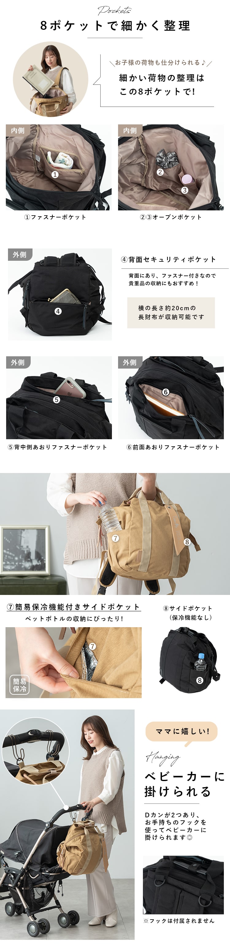 たくさんのポケットで整理整頓しやすく、荷物が多いママも「入れたはずなのにない!」が解消♪