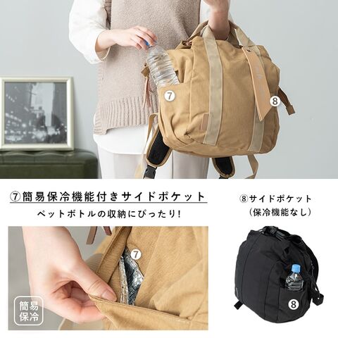 また簡易保冷機能付きのポケットもあり、ボトルの収納にも便利。
