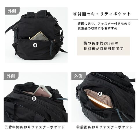 背面にファスナー付きのポケットがあるので、お財布やスマホなどの貴重品を入れられます。