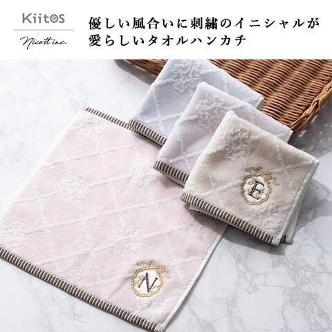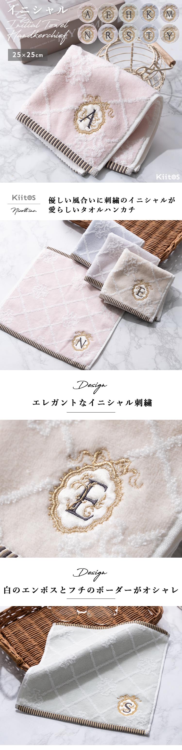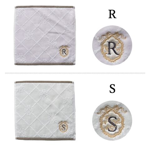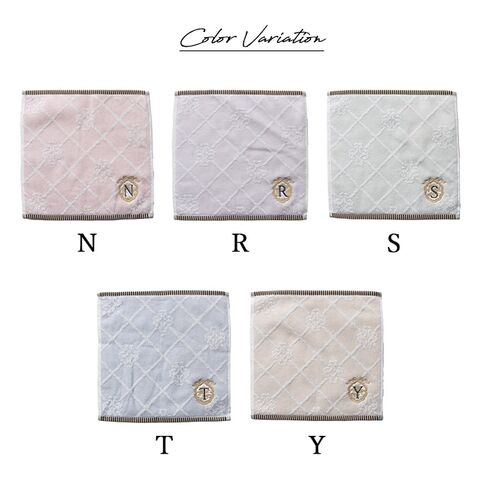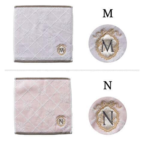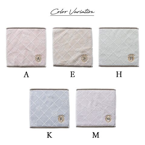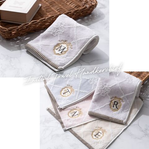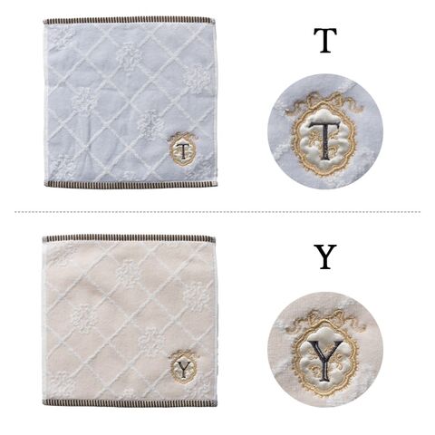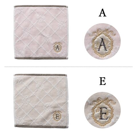 10種類のイニシャルが刺繍されたフェミニンなタオルハンカチ。