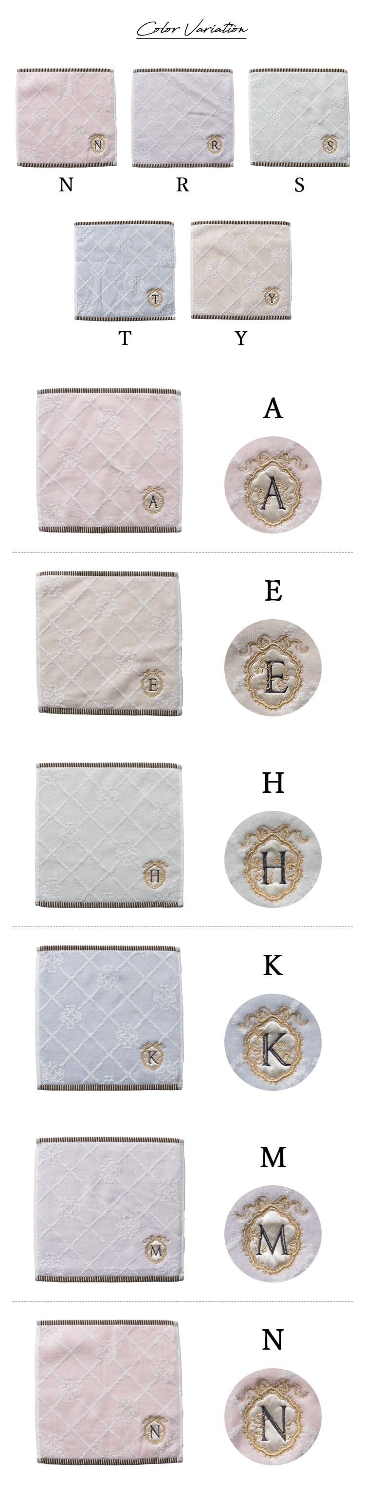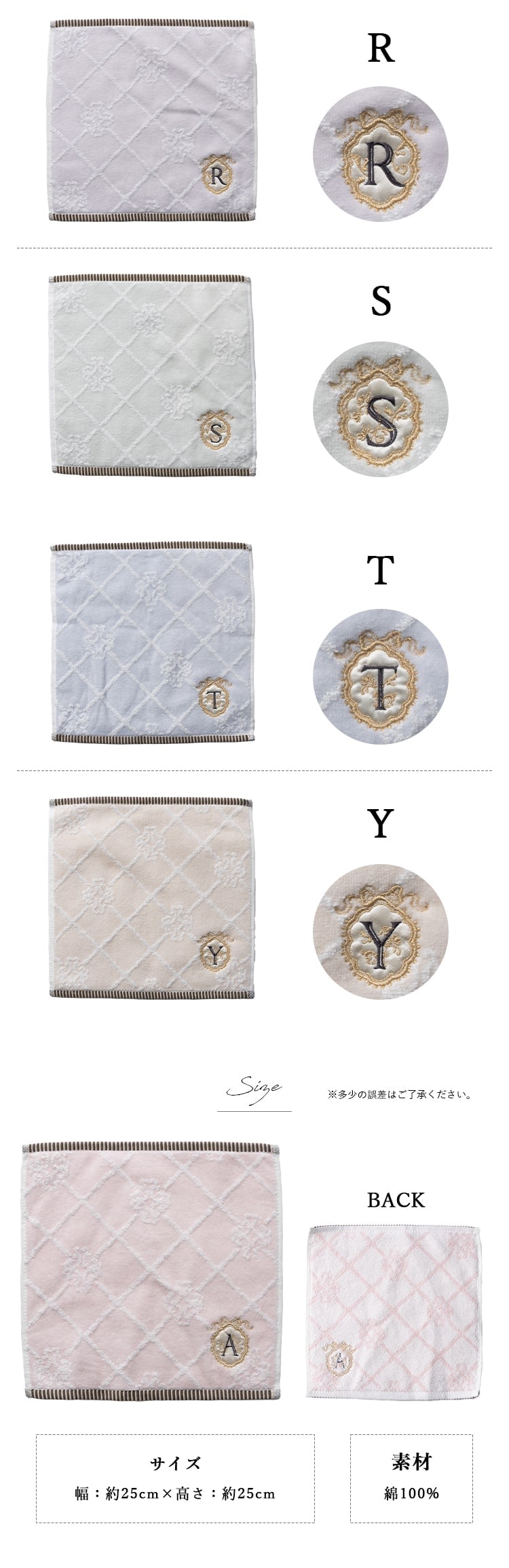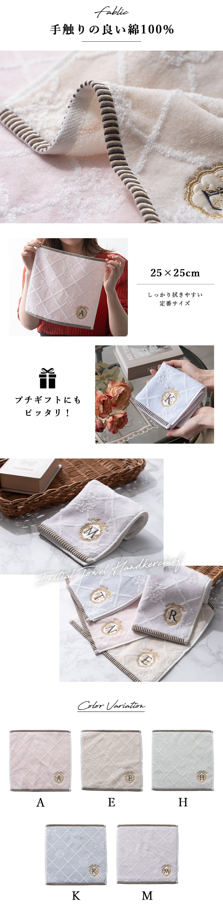10種類のイニシャルが刺繍されたフェミニンなタオルハンカチ。