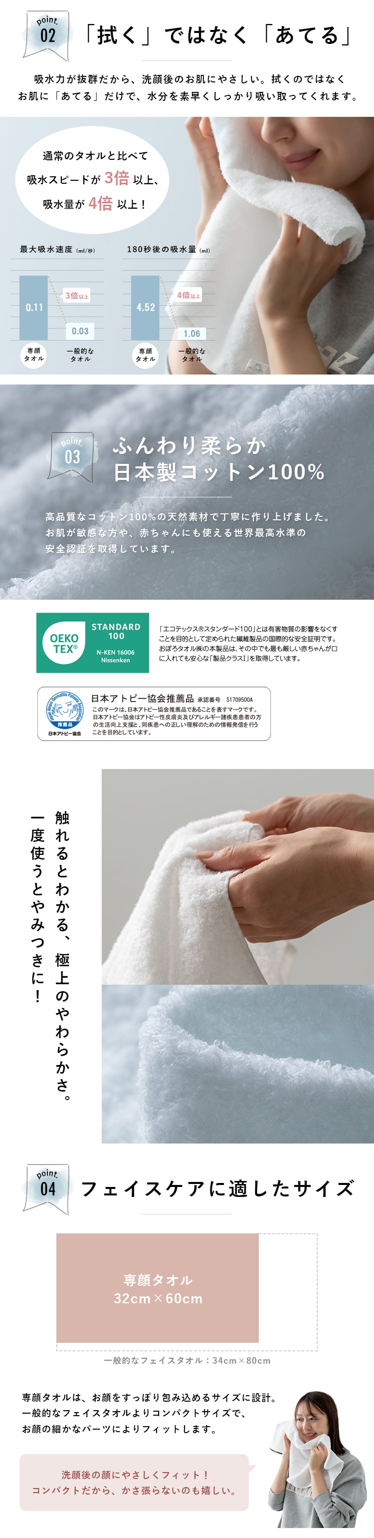 お肌を「拭く」という感覚ではなく、「あてる」だけで水を吸ってくれる「専顔タオル」は、洗顔後の敏感なお肌を優しくケア。