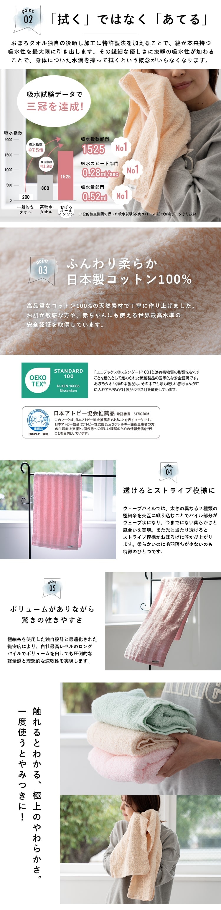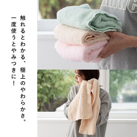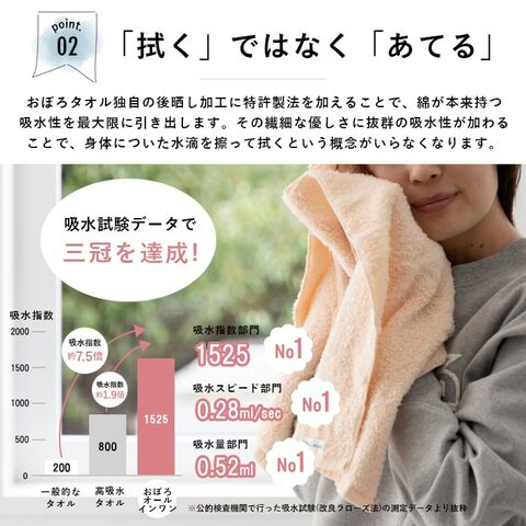 その繊細な優しさに抜群の吸水性が加わることで、身体についた水滴を擦って拭くという概念がいらなくなり、お肌への刺激や摩擦を限りなく少なくしてくれます。