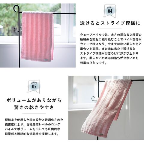 またウェーブパイルでは太さの異なる2種類の極細糸を交互に織り込むことでパイル部分がウェーブ状になり、今までにない柔らかさと風合いを実現。
