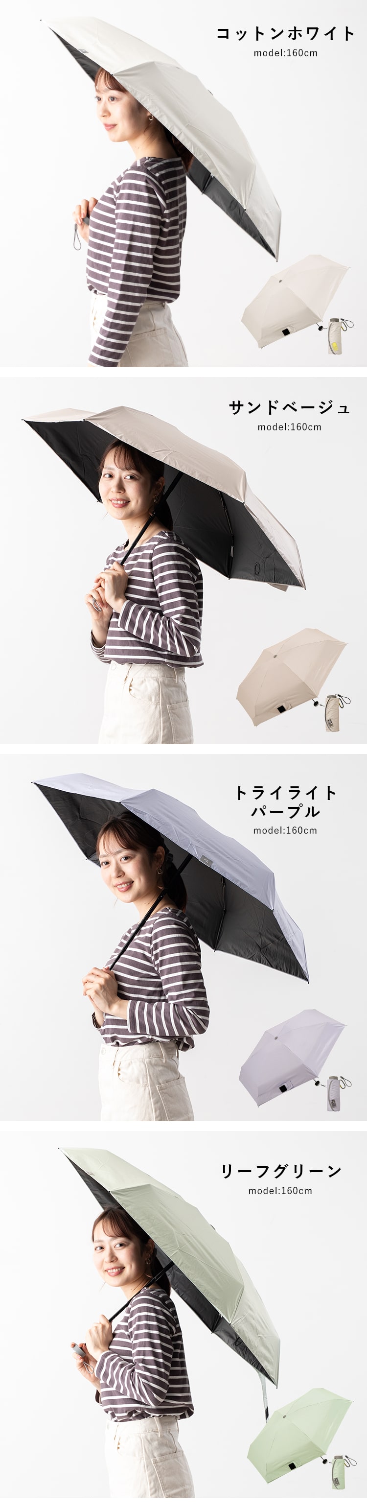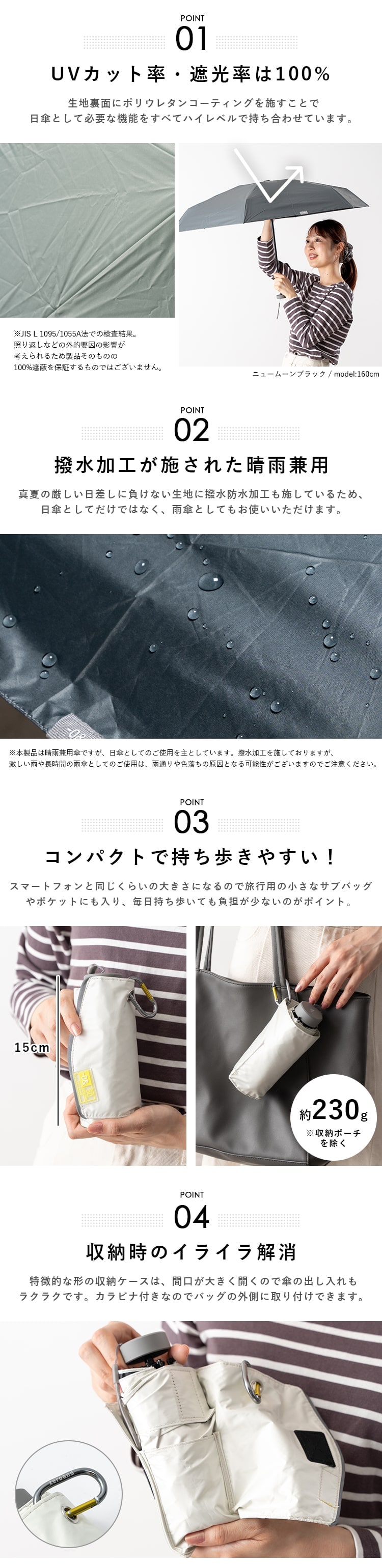 ※本製品は晴雨兼用となっておりますが本来は紫外線防止を目的に開発された生地に撥水加工を施した商品です。激しい雨や長時間雨傘としてのご使用は生地に雨水が染み込む場合がございますので、ご注意下さい。