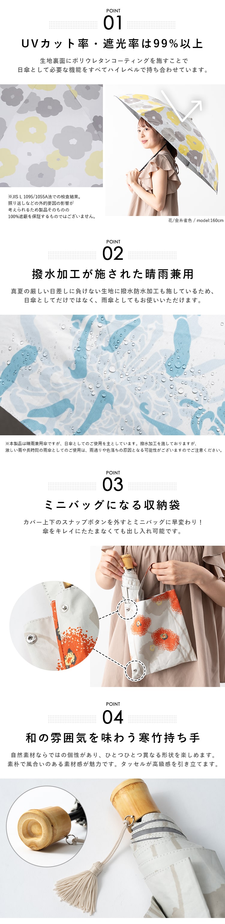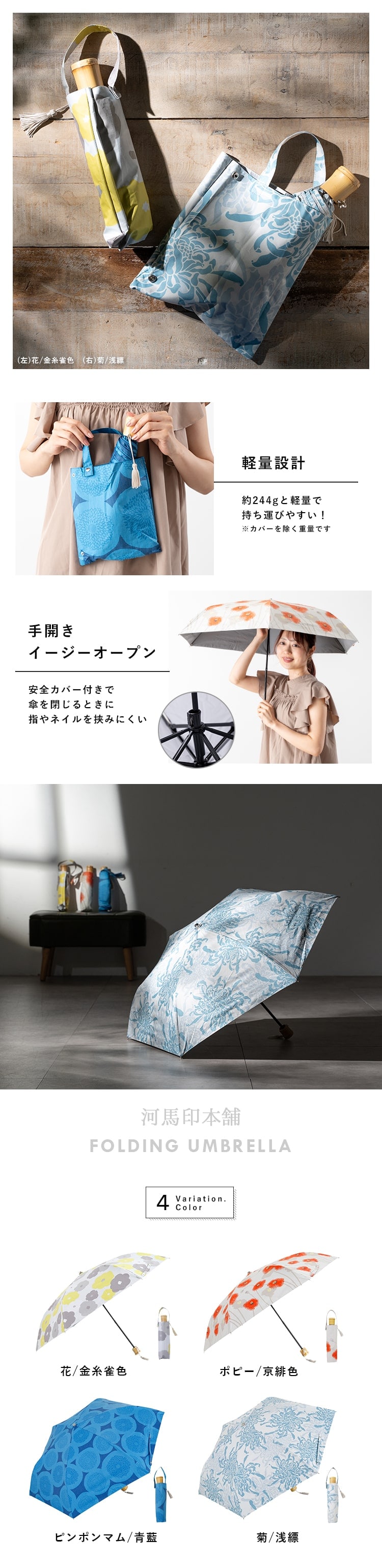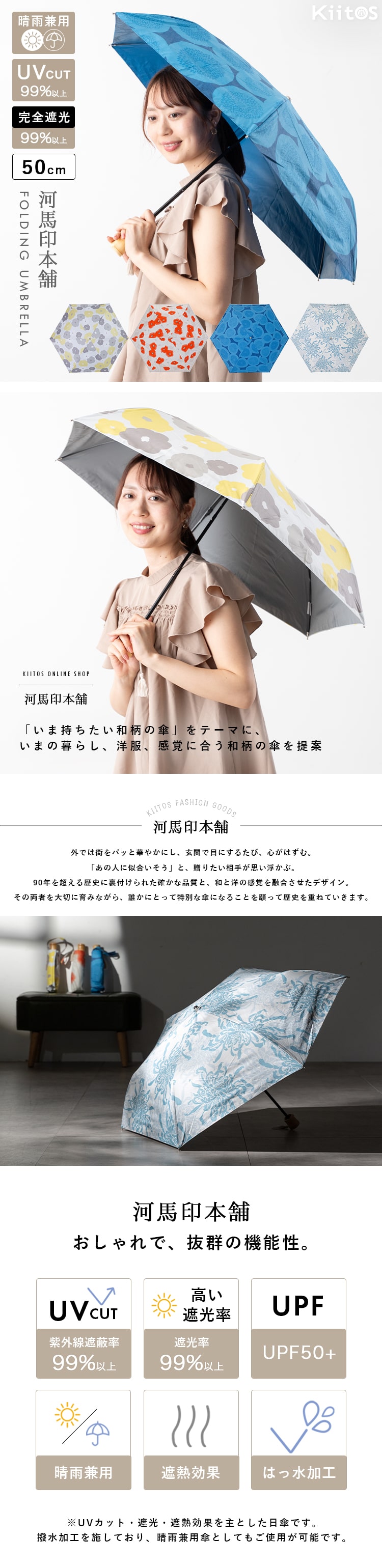 日傘 折りたたみ 軽量 50cm 遮光99% UV 晴雨兼用 ブランド 河馬印本舗 和柄 綿 ポーチ付き 遮熱 撥水 upf50+ おしゃれ 6本骨  花/金糸雀色