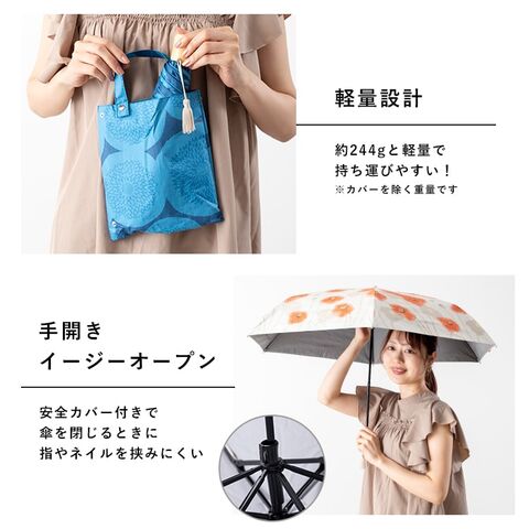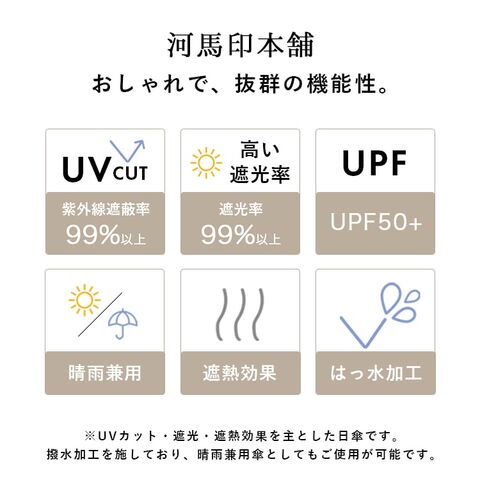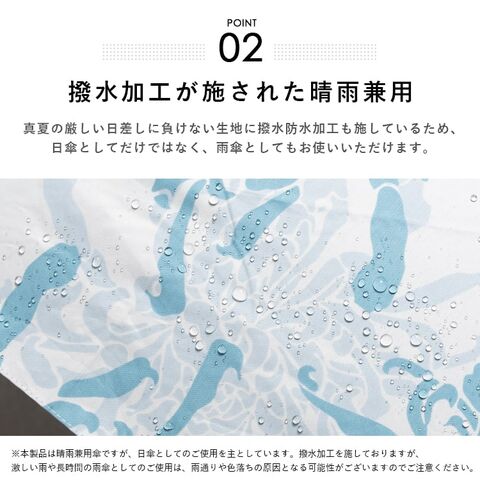 ※本製品は晴雨兼用となっておりますが本来は紫外線防止を目的に開発された生地に撥水加工を施した商品です。激しい雨や長時間雨傘としてのご使用は生地に雨水が染み込む場合がございますので、ご注意下さい。