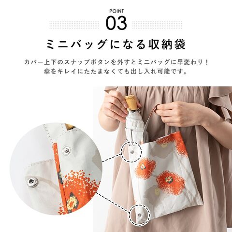 収納袋のスナップボタンを外すとトートバッグ型になり、傘をキレイにたたまなくても出し入れ可能です。